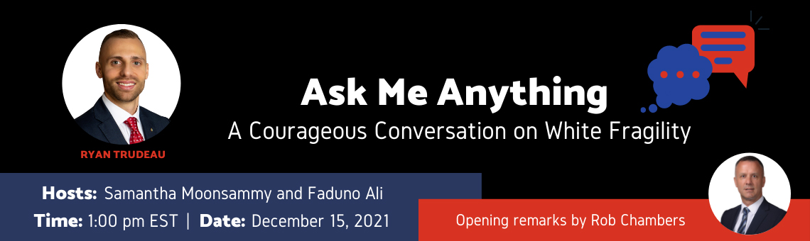 Join us for a courageous conversation on December 15, 2021 at 1pm EST with guest speaker Ryan Trudeau, Senior Innovation and Risk Analyst from Global Affairs Canada on the topic of white humility evolved from white fragility.