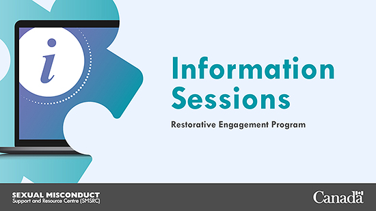 The Sexual Misconduct Support and Resource Centre (SMSRC) is hosting information sessions for its Restorative Engagement (RE) program. If you are a member of the CAF-DND Sexual Misconduct Class Action Settlement and expressed interest in the RE program or a Defence Team member looking to get involved in the program as a Defence representative, these information sessions are for you.