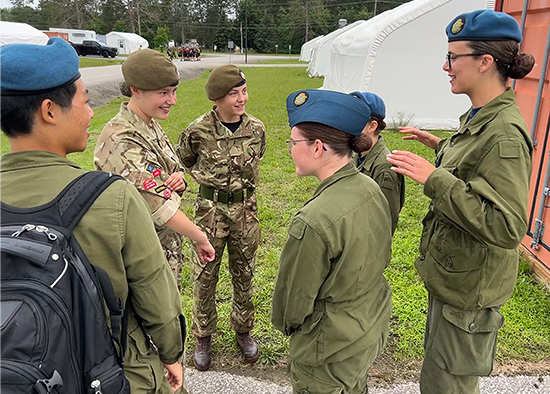 Cadets Katie Parker and Ruby Maxwell of the Army Cadets UK, and Staff Cadets Grant Wang, Chloe Hodge, Sabrina Muscat and Olivia MacNamara from the Blackdown Cadet Training Centre meet for the first time and discuss uniform differences during an international exchange at CFB Borden, Ont. July 9, 2023.