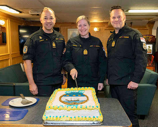 His Majesty's Canadian Ship (HMCS) Vancouver celebrates its 30th birthday at sea, from the left, Coxswain, Chief Petty Officer First Class (CPO 1) Derek Dawson, Commanding Officer, Commander Meghan Coates and Executive Officer, Lieutenant-Commander (LCdr) Jordan Thwaites stand together for the cake cutting celebration on 22 August 2023, in the Pacific Ocean.