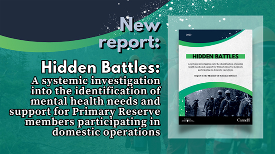 In the report entitled Hidden Battles: A systemic investigation into the identification of mental health needs and support for Primary Reserve members participating in domestic operations, the Ombudsman made six evidence-based recommendations to the Minister of National Defence. If accepted and implemented, these recommendations will contribute to the well-being of Primary Reserve members.