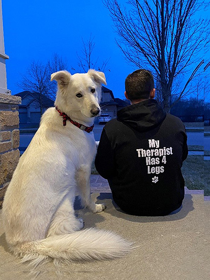 Lieutenant (Lt) Andrew Gough and his service dog Riggs work together to maintain and promote workplace health for Lt Gough, as well as others in the Defense community.