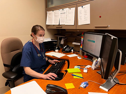 Nurse Practitioner LCol Klepach reviews a patient’s chart at CF H Svcs C O