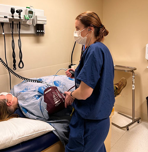 Nurse Practitioner LCol Klepach assesses a patient at CF H Svcs C O
