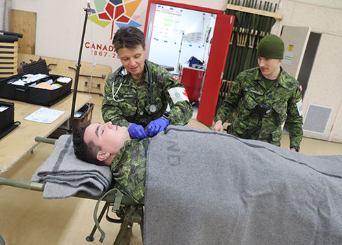 Nurse Practitioner Major LeBlanc in CAF Alert assessing a patient while participating in a CFS Alert Station wide mock disaster, mass casualty exercise.