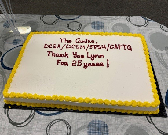 White cake with yellow frosting as a border sitting on a table – written: “The Centre, DCSA/DCSM/JPSU/CAFTG Thank you Lynn For 25 years!”.