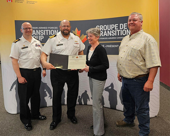 Standing is Lynn Dubreuil smiling while she receives her award certificate (On the left is CPO 1 M. Boniface CWO of the Canadian Armed Forces Transition, next to him is Capt(N) G.W. Adamthwaite – Deputy Commander of the Canadian Armed Forces Transition Group (CAF TG), next to him is Lynn Dubreuil and on the right is CAF TG Compt, Marc Papillon.