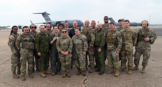 Group photo of participants from the 621st Contingency Response Wing of the United States Air Force during Exercise STORM FLAG 24-07 at Alexandria International Airport in Louisiana. Two members of 2 Wing (in green uniforms), Captain Estéban Simard and Sergeant Dany Rioux, are among them. 8 May 2024. Photo credit: Tech. Sgt. Anastasia Tompkins, United States Air Force.
