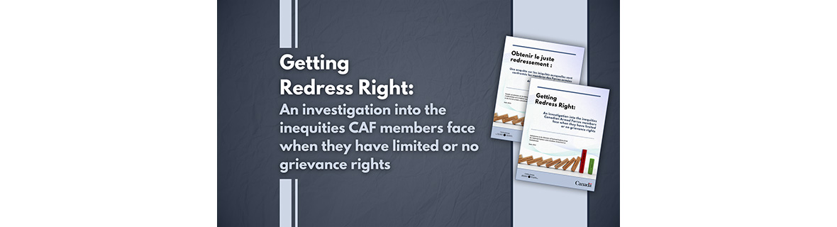 Getting Redress Right: An investigation into the inequities Canadian Armed Forces (CAF) members face when they have limited or no grievance rights is the second of two reports following the Ombudsman’s systemic review of CAF military complaint mechanisms. It is also his final report before his mandate ends on 2 July.