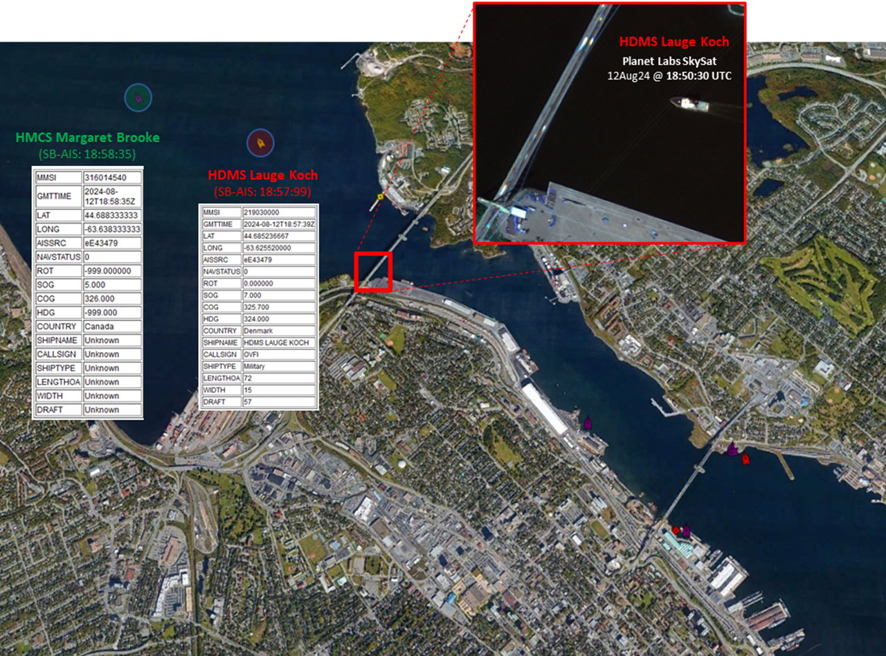 EN: Figure 1: AIS reported positions of two of the four Commander’s Task Group (CTG) 300.10 vessels departing assembly area HMC Dockyard Halifax as part of OP NANOOK 2024. In the main image, AIS data overlaid on Google Maps shows the HDMS Lauge Koch sailing behind HMCS Margaret Brooke and around the Bedford Basin. The upper right inset image shows the HDMS Lauge Koch captured in the Planet Labs SkySat image acquired on 12 August 2024 at 18:50:30 UTC whilst its position was reported 7 minutes later by AIS.