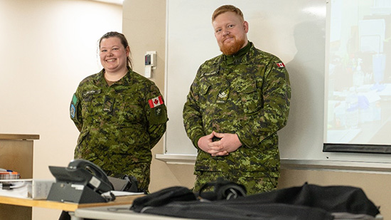 Private Sautiere and Master Corporal Humalamaki are standing in the classroom at St. Lawrence College in Kingston, ON, after their presentation about what a Cook does in the Canadian Armed Forces on March 3, 2025.