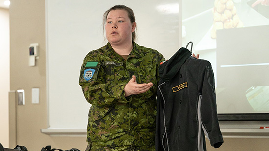Private Sautiere is showing the uniform for cooks in the Canadian Armed Forces to students at St. Lawrence College in Kingston, ON, during a presentation on March 3, 2025.