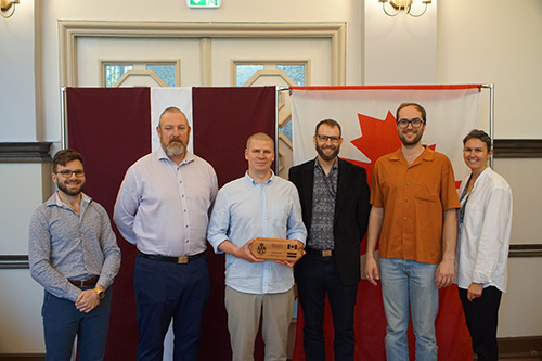 From left to right: Maj Kiernan Broda-Milian, CyTF2 Commander; Col Jason Smith, CAFCYBERCOMD COS Ops (Surge Observer); Mr Varis Teivans, CERT.LV Technical Director and Deputy Manager; LCol James Siebring, CO CFNOC (surge Observer); Mr Rudolfs Kelle, CERT.LV Threat Hunting Lead (surge co-leader); and Mrs Agense Krike, CERT.LV Strategic Projects and Partnerships. The plaque held by Mr Teivans was made and presented by LCol Siebring in recognition of the three-year partnership between CERT.LV and the CAF.