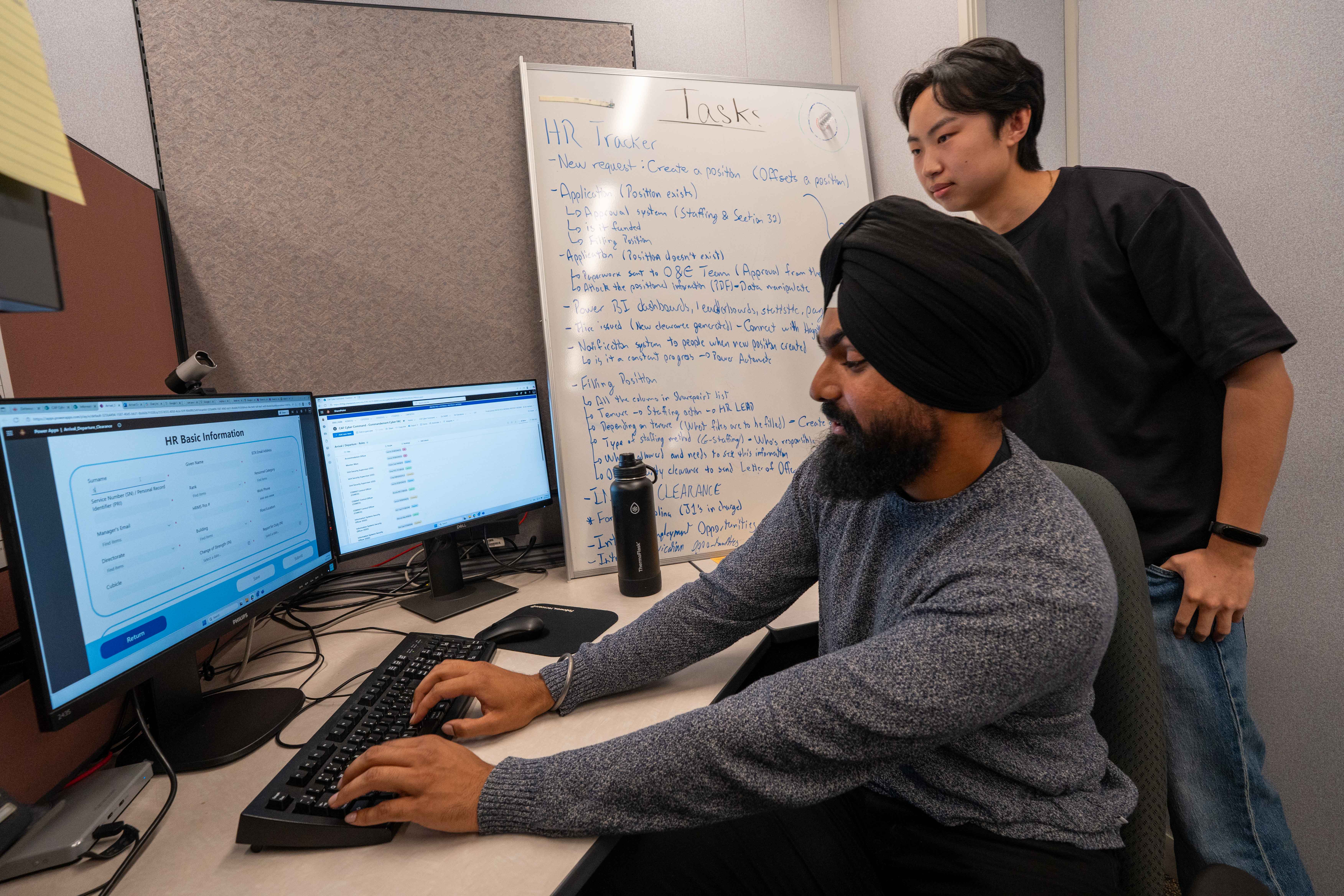 Harjot Singh Sandhu (University of Ottawa) and Tony Zheng (Carleton University) collaborate on a project during their paid summer internship at CAFCYBERCOM Headquarters.