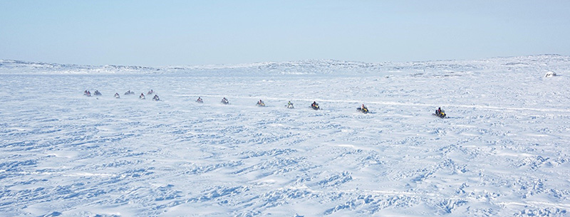 A group of snowmobiles travels in a single-file line across a vast, flat snow-covered landscape. The terrain is expansive and open, with distant hills or ridges visible on the horizon. The sky is clear and blue, suggesting calm weather conditions in this remote, wintry environment.