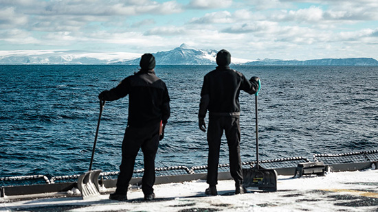 Sailor First Class Daniel Bridges, a boatswain (left), and Sailor Third Class Ray Beals, a Naval Combat Information Operator, take a break from shoveling the flight deck of HMCS MARGARET BROOKE to admire King George Island during Operation PROJECTION 25-01 on 28 February 2025.