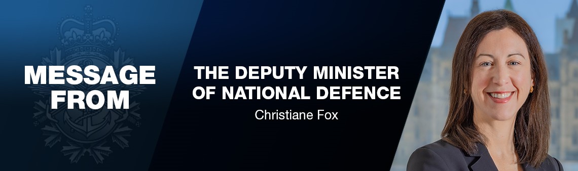 It is an honour to join the Department of National Defence (DND) as your new Deputy Minister. This department has a pivotal role to play at a defining point in Canada’s history, and I’m excited to work with you as we deliver on this important agenda. I am particularly grateful for the warm welcome during these early days of my transition, and for your patience and support as I better familiarize myself with the organization and its people, priorities, and processes.