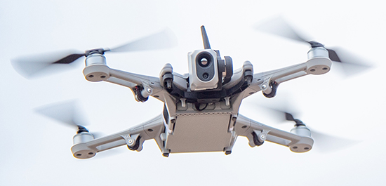 A quadcopter drone hovers in mid air during a flight demonstration.