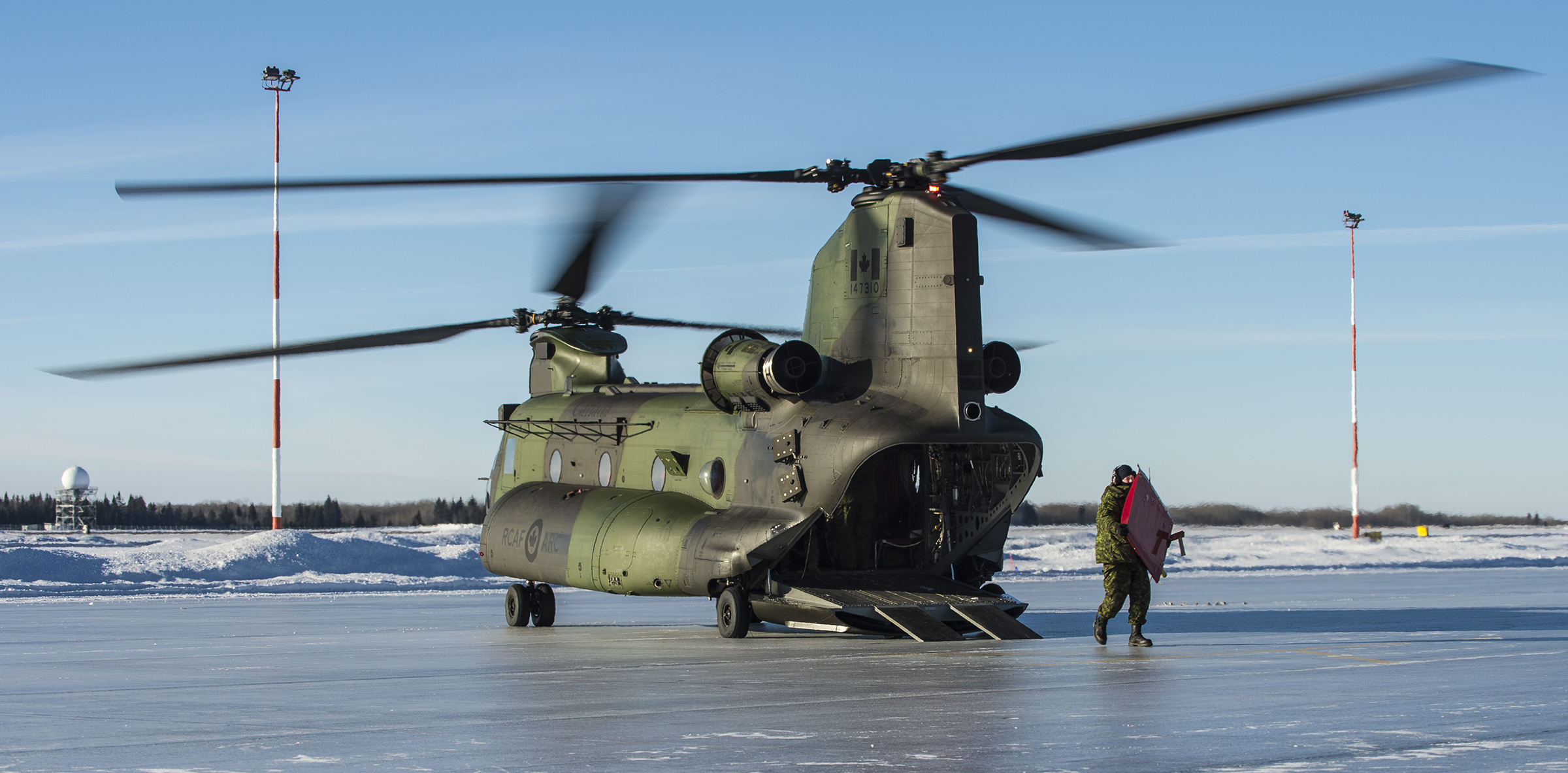 Tuesday, January 15, 2019, was clear and cold with a minimum temperature of about -30C and a daytime temperature of about -20C. The ramp was icy as the Chinook was towed out of its hangar and the “mule”, the towing vehicle, had a hard time getting traction. Later in the day, however, when the Chinook and its load returned to base, the icy ramp and runway worked in their favour, as other flying at 4 Wing had been cancelled for the day, leaving wide open airspace and an empty tarmac for the Chinook to manoeuvre in.