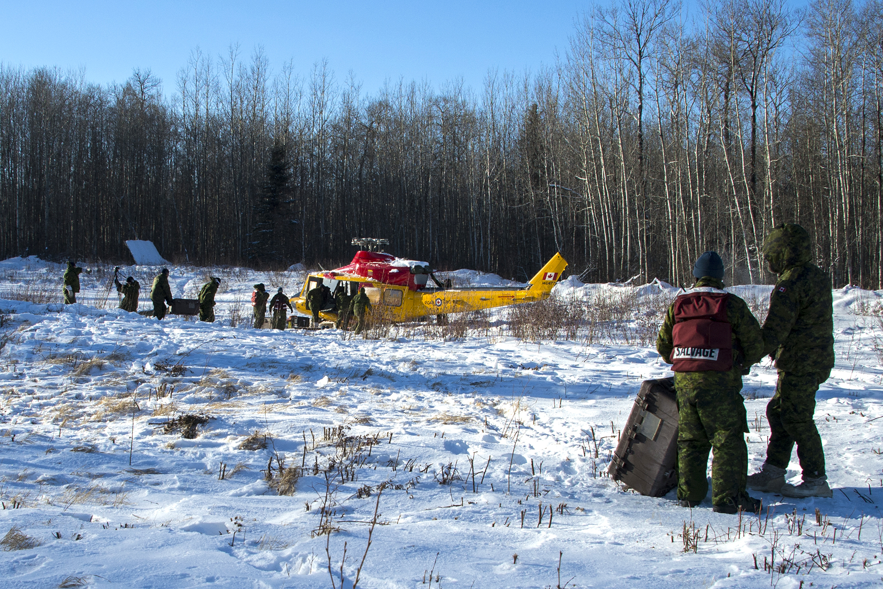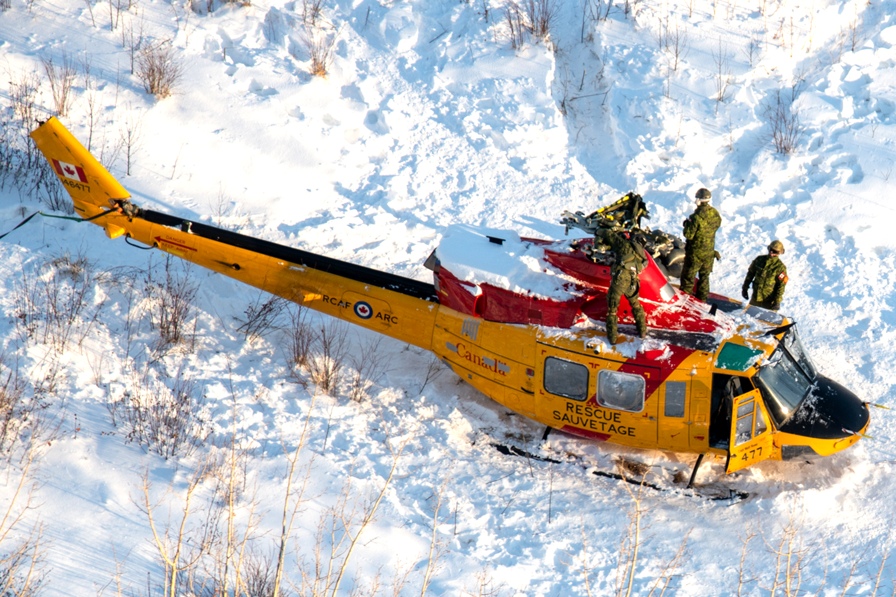 Nineteen passengers were on the flight: six maintainers from 408 Tactical Helicopter Squadron, three personnel from the Tactical Air Movements (TAMS) Section at 1 Service Battalion, two TAMS personnel from the Canadian Army Advanced Warfare Centre, two from the Aerospace and Telecommunications Engineering Support Squadron, two photographers from the Aerospace Engineering Text Establishment (AETE), a medic and three recovery and salvage personnel from 4 Operational Support Squadron. Five aircrew from 450 Squadron were aboard the Chinook; other personnel supporting the mission included three members of 450’s maintenance detachment, an aircrew of three flying a Griffon from 408 Tactical Helicopter Squadron, additional personnel from AETE, maintenance personnel from 417 Combat Support Squadron and four more photographers.In all more than 50 personnel from nine units participated in the recovery.