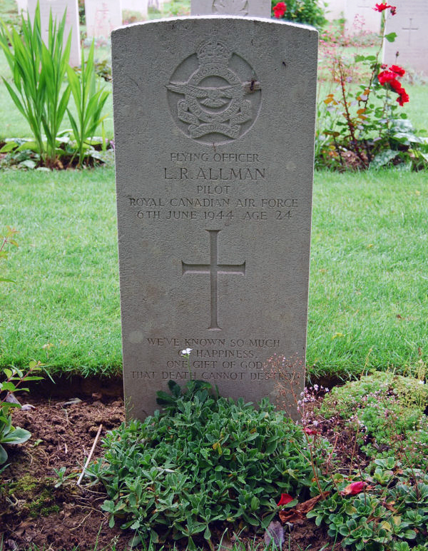 Flying Officer Leonard Ralph Allman, a pilot with 440 Squadron. Killed in action when his Typhoon aircraft was shot down while attacking enemy transport. From Toronto, Ontario, age 25. Buried in Beny-Sur-Mer Canadian Cemetery, France.