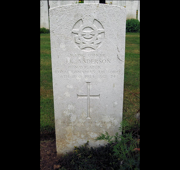 Flying Officer James Kennedy Anderson, a navigator with 196 (RAF) Squadron. Killed in action when he bailed out of his Stirling aircraft over the English Channel. From Winnipeg, Manitoba, age 21. Buried in the Calais Canadian War Cemetery, France.