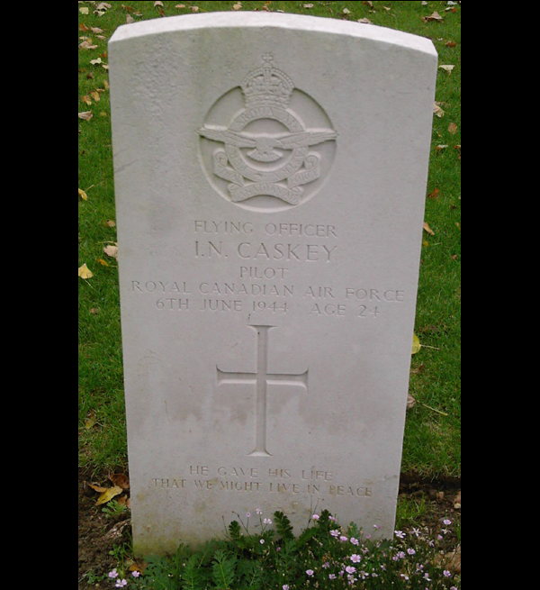 Flying Officer Irvine Nathaniel Caskey, a pilot with 620 (RAF) Squadron. Killed in action along with Flying Officer T.F. Barker and the remainder of the crew when his Stirling aircraft was shot down while part of the airborne assault. Born in Portage La Prairie, Manitoba, aged 24. Buried in the La Delivrande War Cemetery, France.