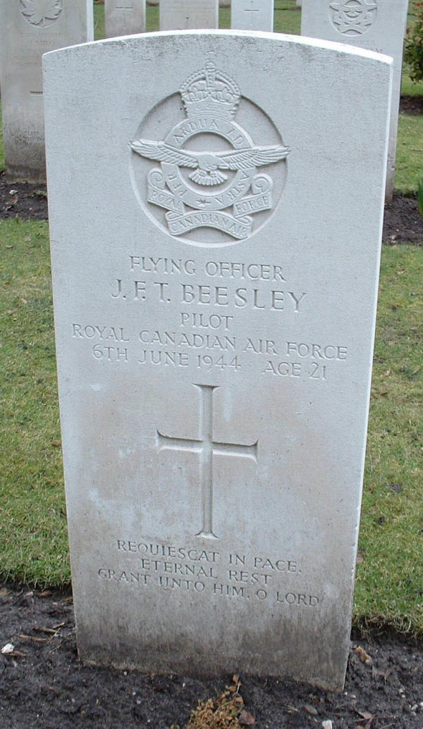 Flying Officer Joseph Francis Terence Beesley, a pilot with 426 Squadron. Killed in action after an attack on a coastal battery near Trouville, France, when his Halifax aircraft exploded in mid-air. The remainder of the crew, five members of the RCAF—Pilot Officer Carol, Pilot Officer Durnin, Pilot Officer Forsberg, Flying Officer Irvine, and Flying Officer Tranter—and one RAF flight engineer were also killed. From Smithers, British Columbia, age 21. Buried in the Brookwood Military Cemetery, Surrey, England.