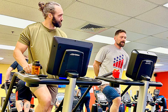Captain Félix Vincent (right) and Warrant Officer Mathieu Blanchette (left) train on the stair climber at the Canadian Forces Base Bagotville gym to simulate the ascent of the Mont-Édouard and improve their cardiovascular endurance.
