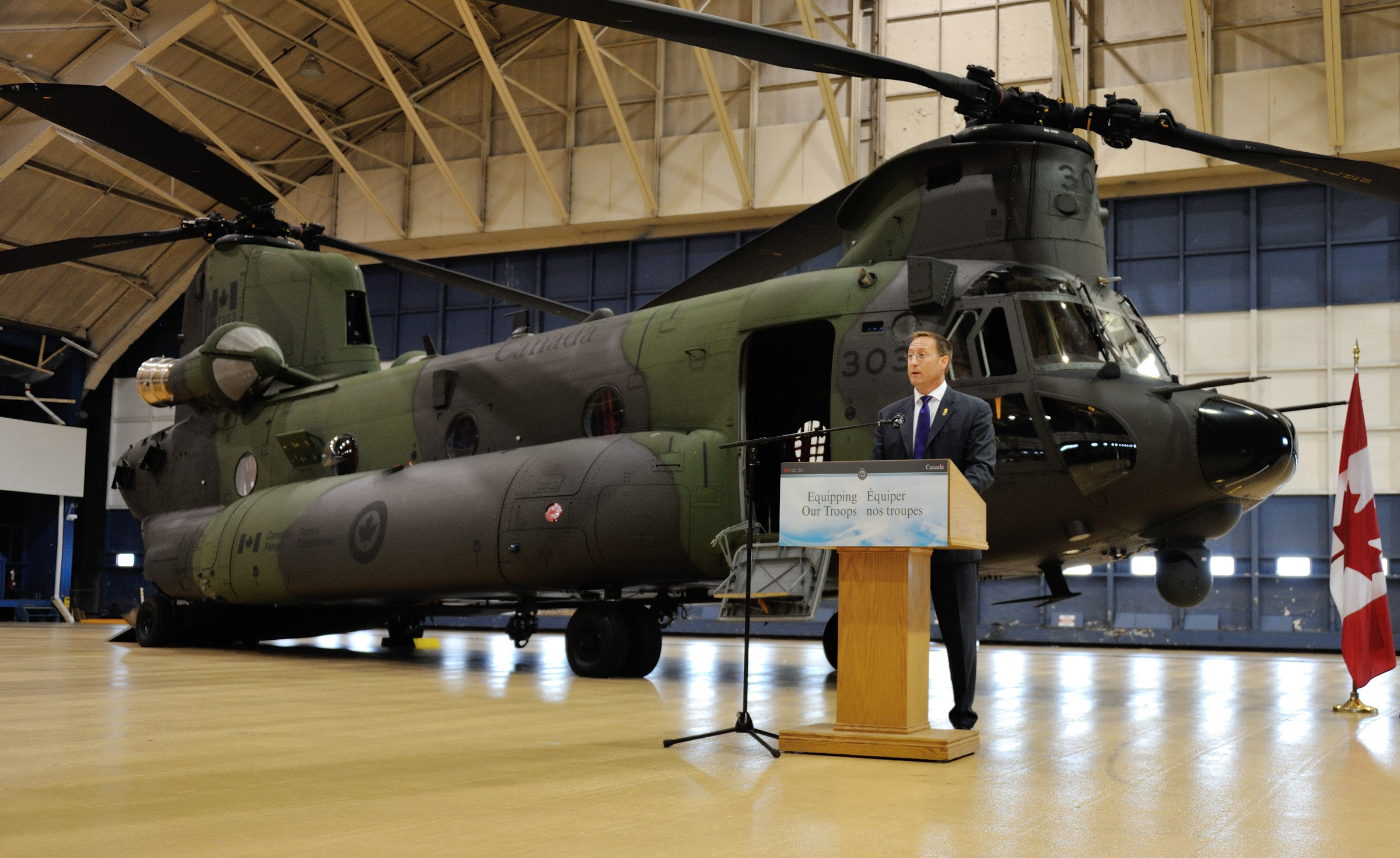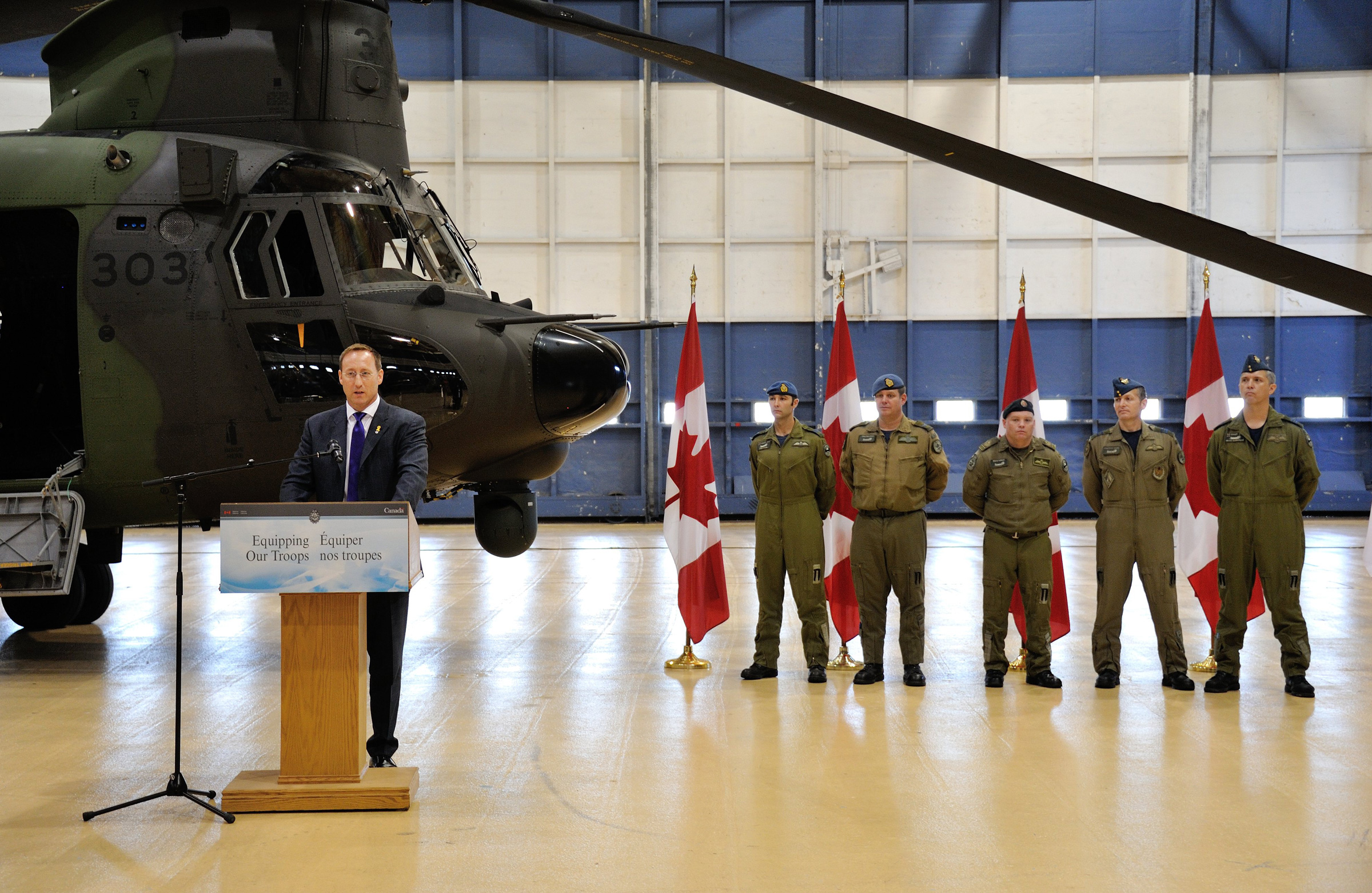 “It’s a real pleasure to be here on this historic day for the Royal Canadian Air Force,” said Defence Minister Peter MacKay, “[and] I should also note that this is a big day for the Army as well. I know from having visited with our troops in Afghanistan [that] there was nothing that brought bigger smiles and more relief to their faces than the sight of a Chinook helicopter overhead.