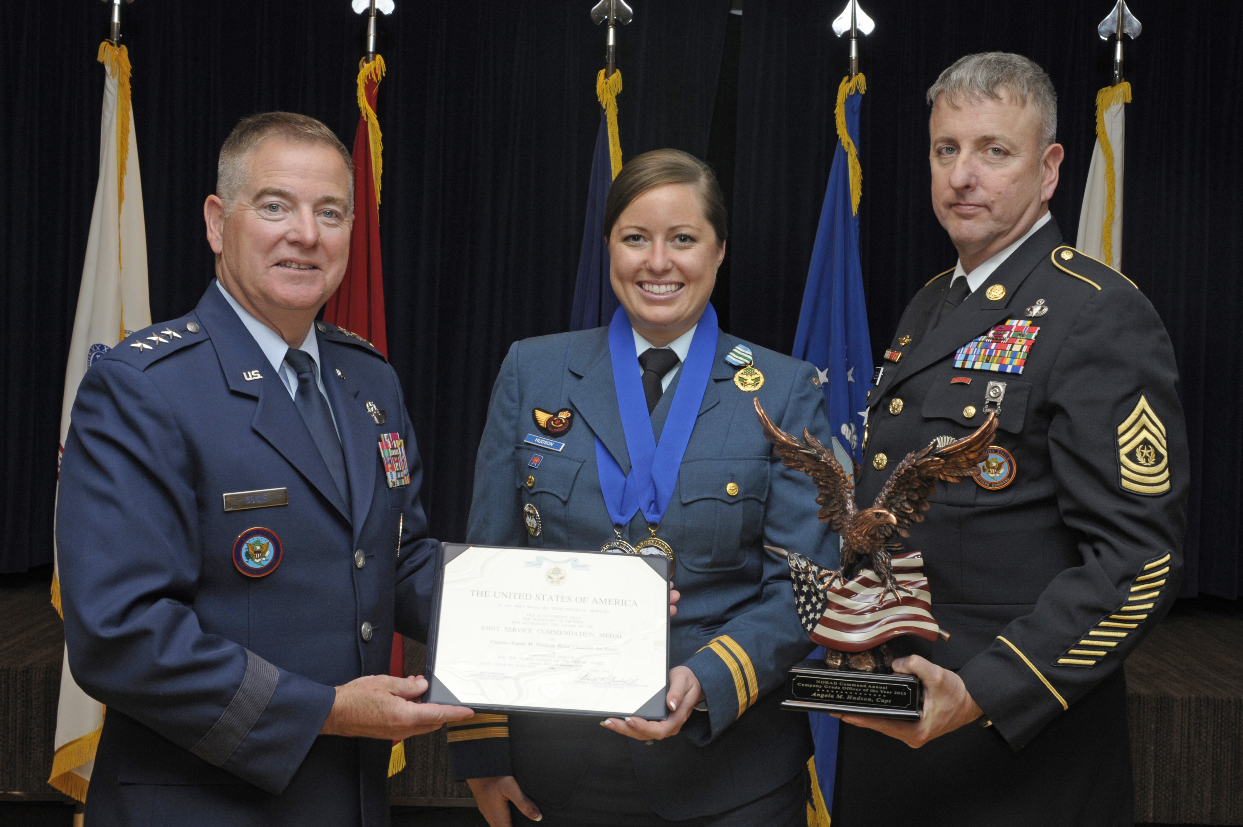 The NORAD Company Grade Officer of the Year went to Captain Angela Hudson who serves in Rome, New York, at the NORAD / USNORTHCOM Eastern Air Defense sector, which is one of the two sectors responsible to NORAD for air sovereignty and strategic air defence of North America.