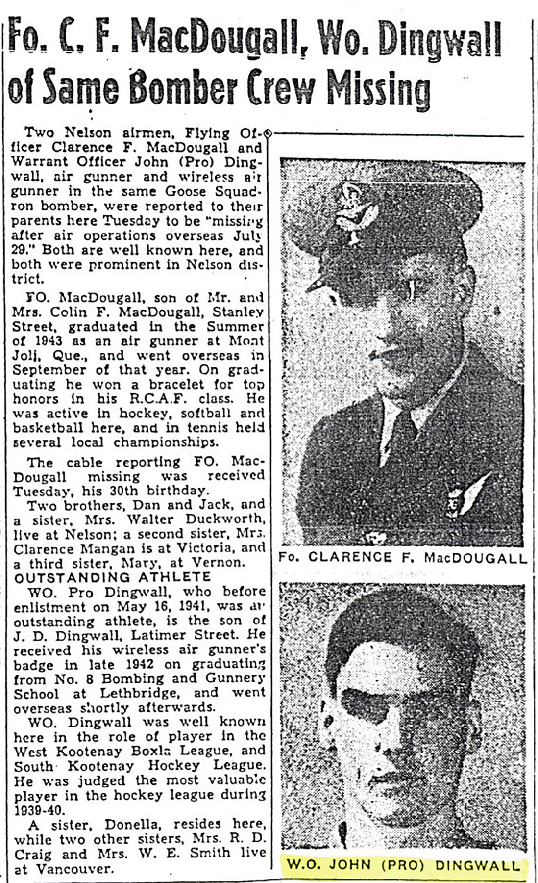 While members of 408 Squadron mourned the loss of their comrades, families of the missing men faced a different ordeal. Each family would have received a short telegram informing them that their loved one was “missing”. With this one word, families were sentenced to an emotional limbo, where hope fought a daily battle with grief, and the arrival of a letter or telegram was dreaded. When the awful possibility of death was finally confirmed, there were no remains to bury or grave to visit. Their loved one rested in a foreign cemetery or a final unknown resting place.