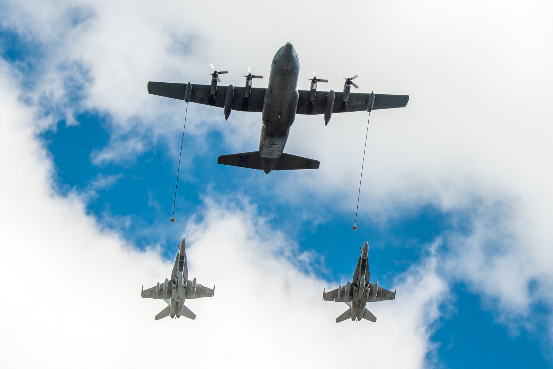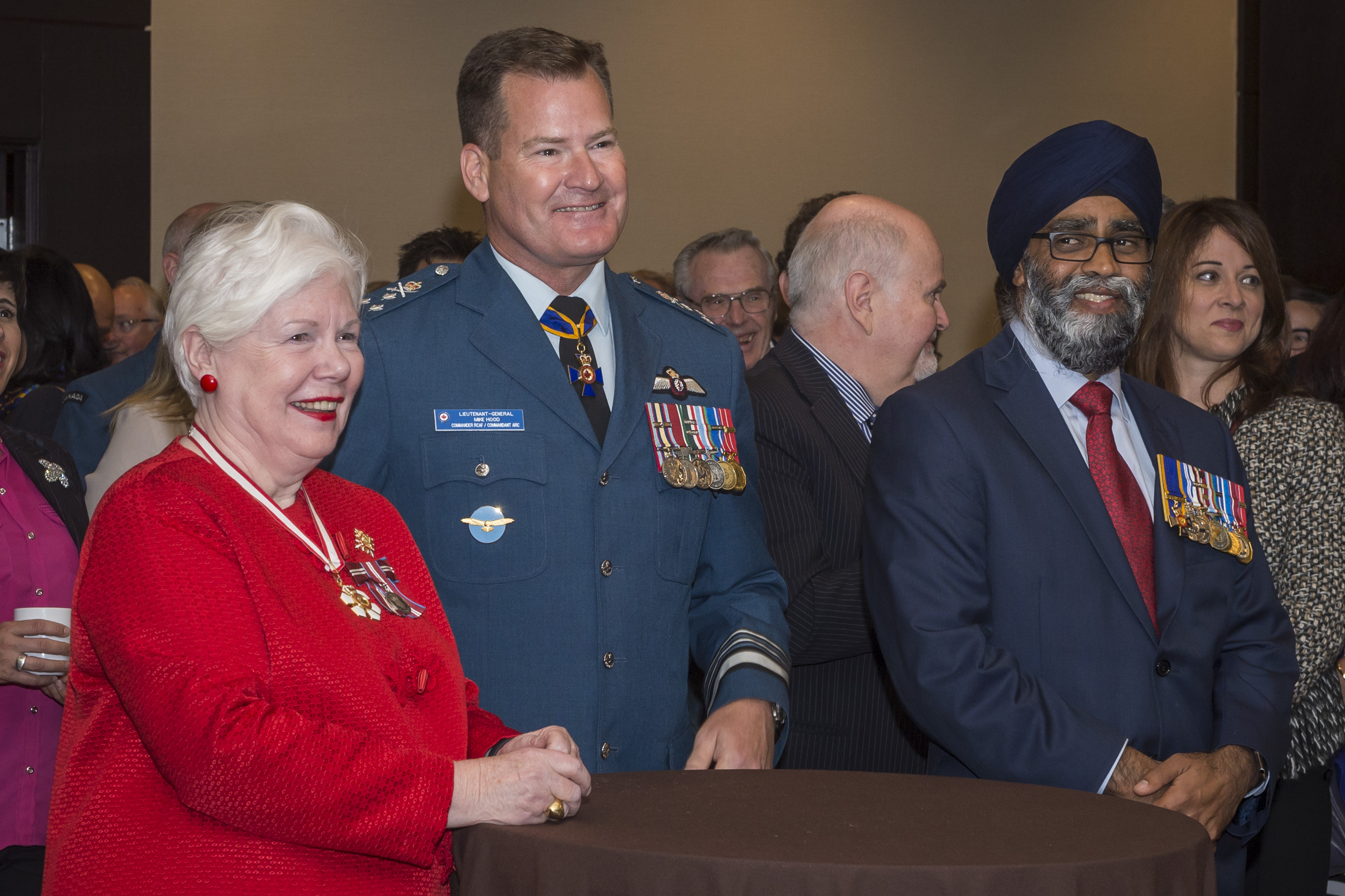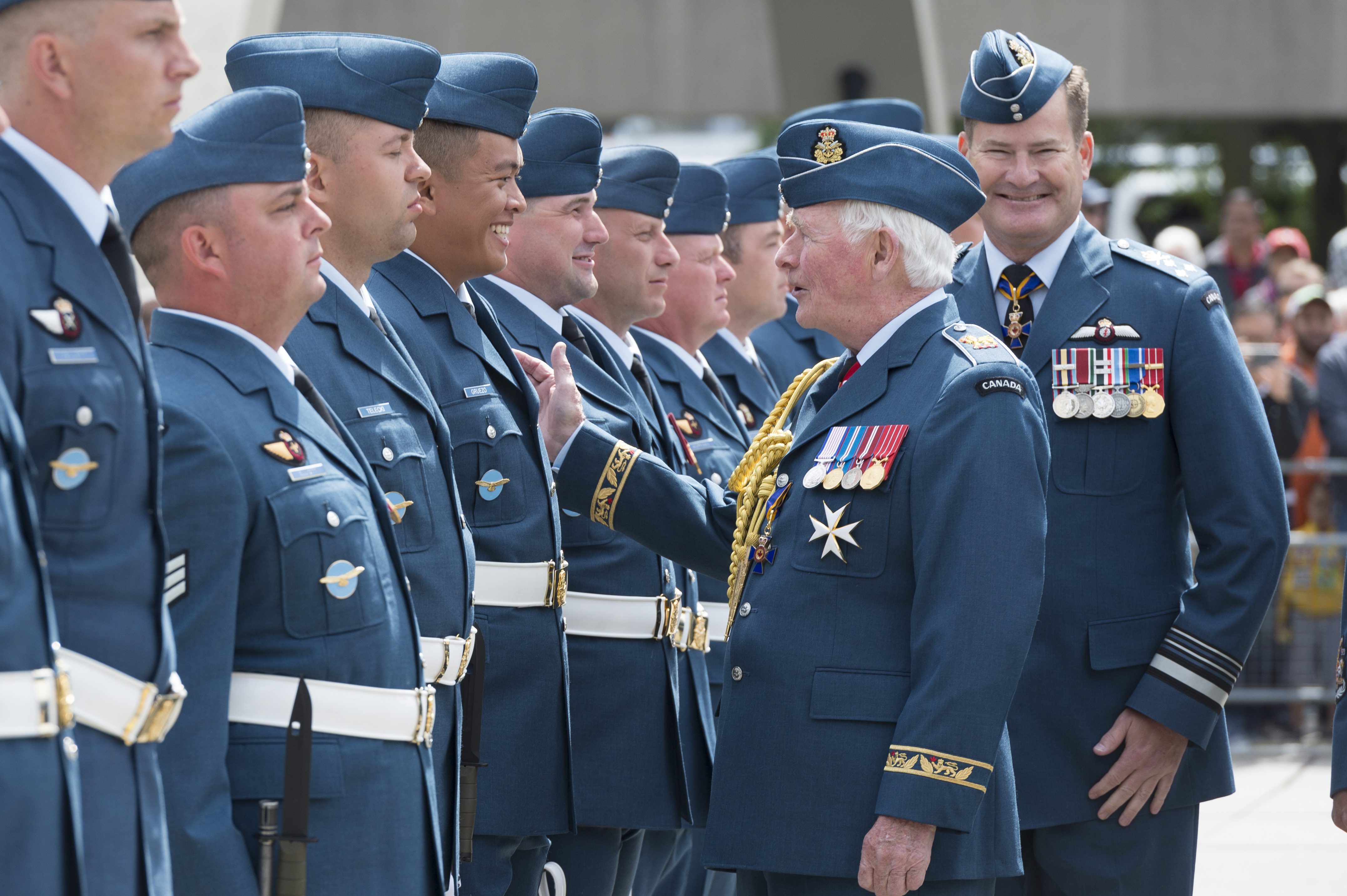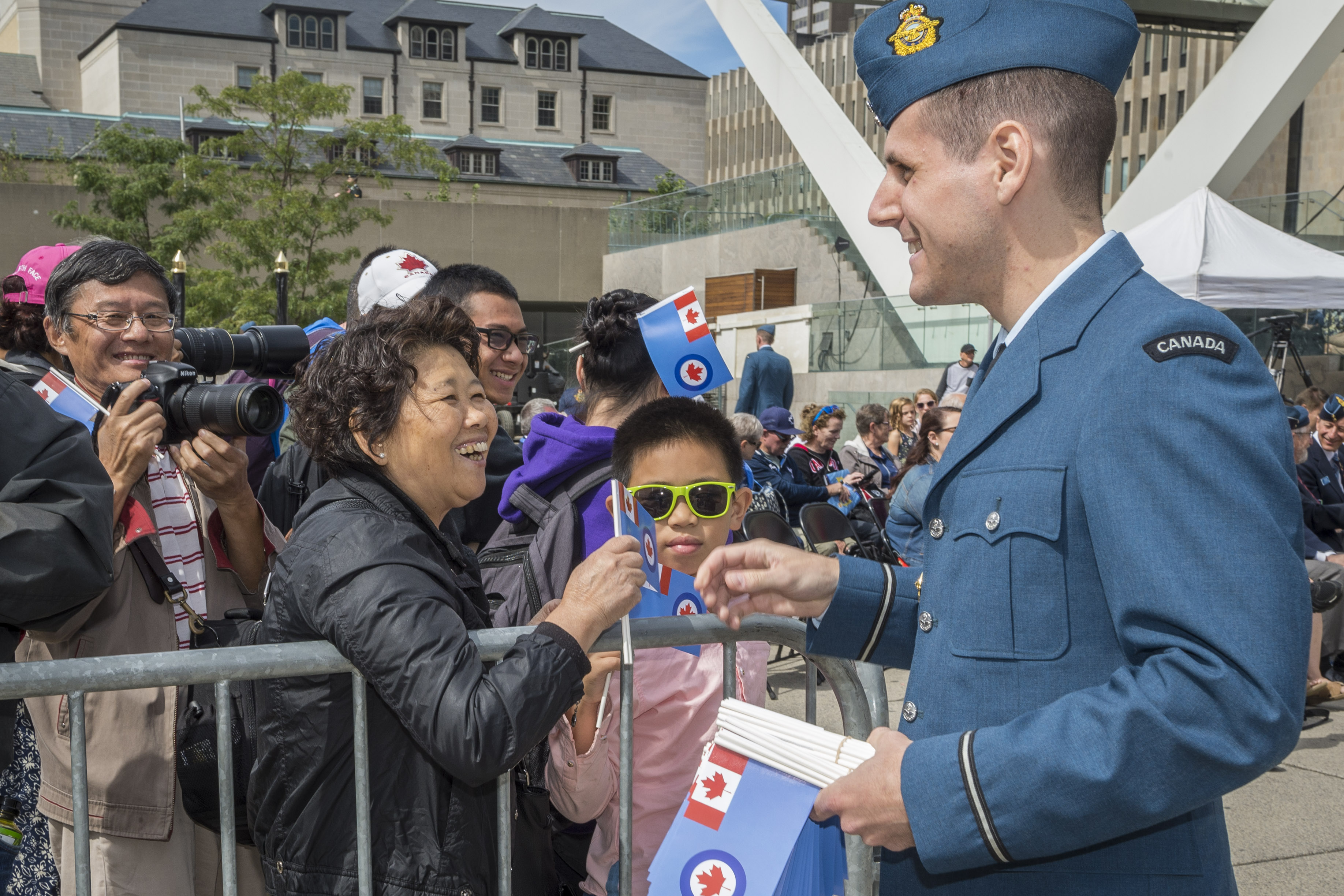 As the commander of the RCAF concluded his remarks, a representative of nearly every aircraft flown by the Air Force roared through the sky above Toronto, to the delight of spectators young and old. The “parade in the sky” concluded with the Canadian Forces Snowbirds and the CF-18 Demo Hornet, sporting a paint scheme honouring the 150th anniversary of Canadian Confederation.