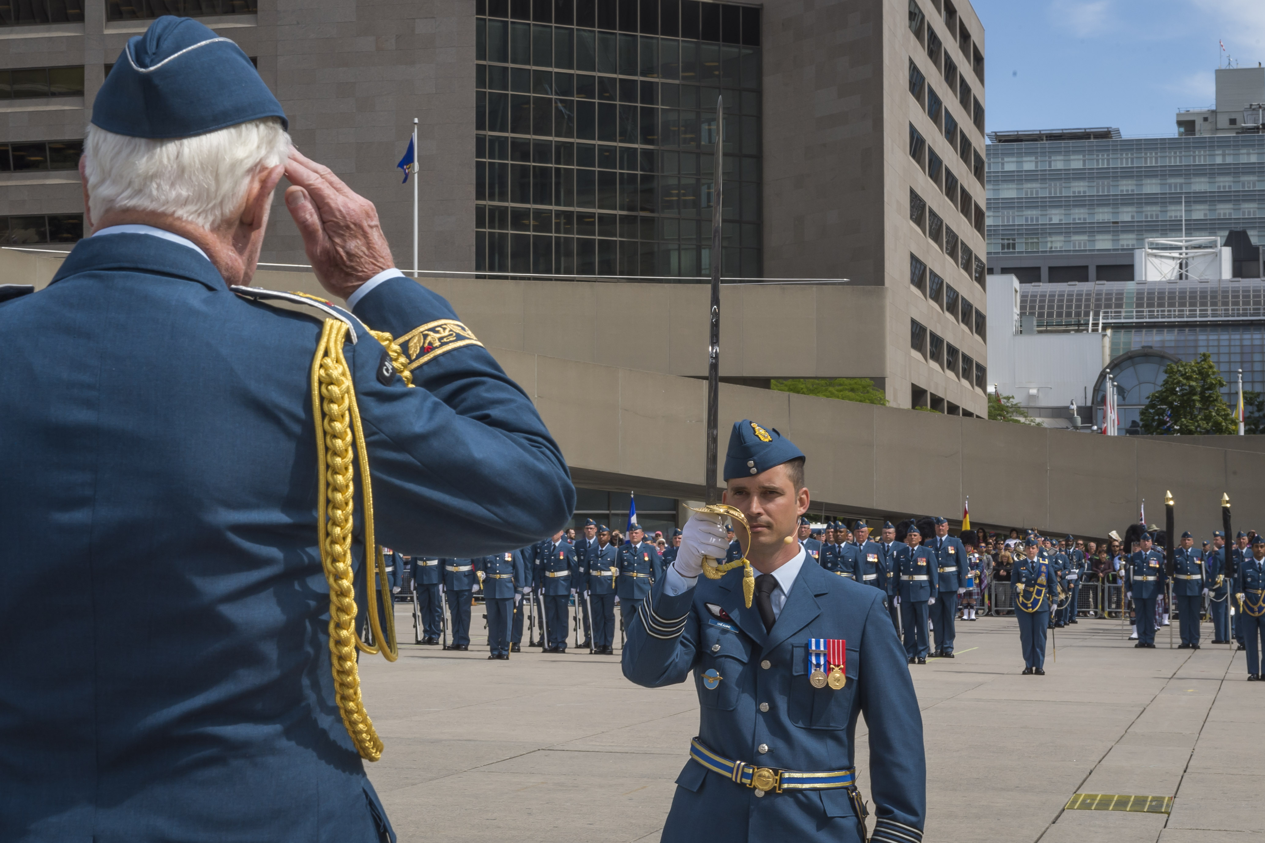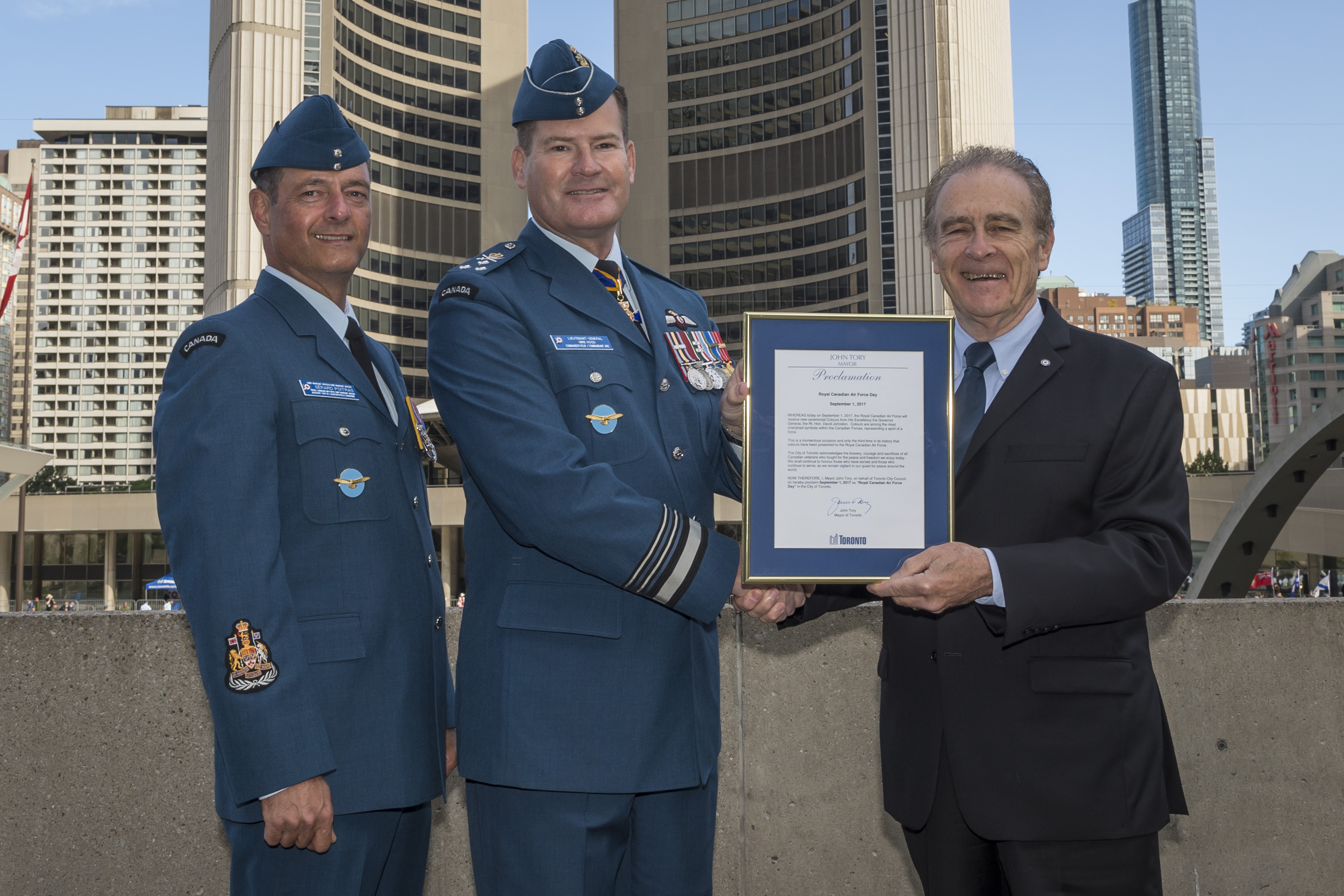 The day began with the ceremonial raising of the RCAF flag (not to be confused with the Colours) at Toronto City Hall by Lieutenant-General Hood and Councillor Norm Kelly. Acting on behalf of Mayor John Tory, Mr. Kelly then proclaimed September 1 as “Royal Canadian Air Force Day”.