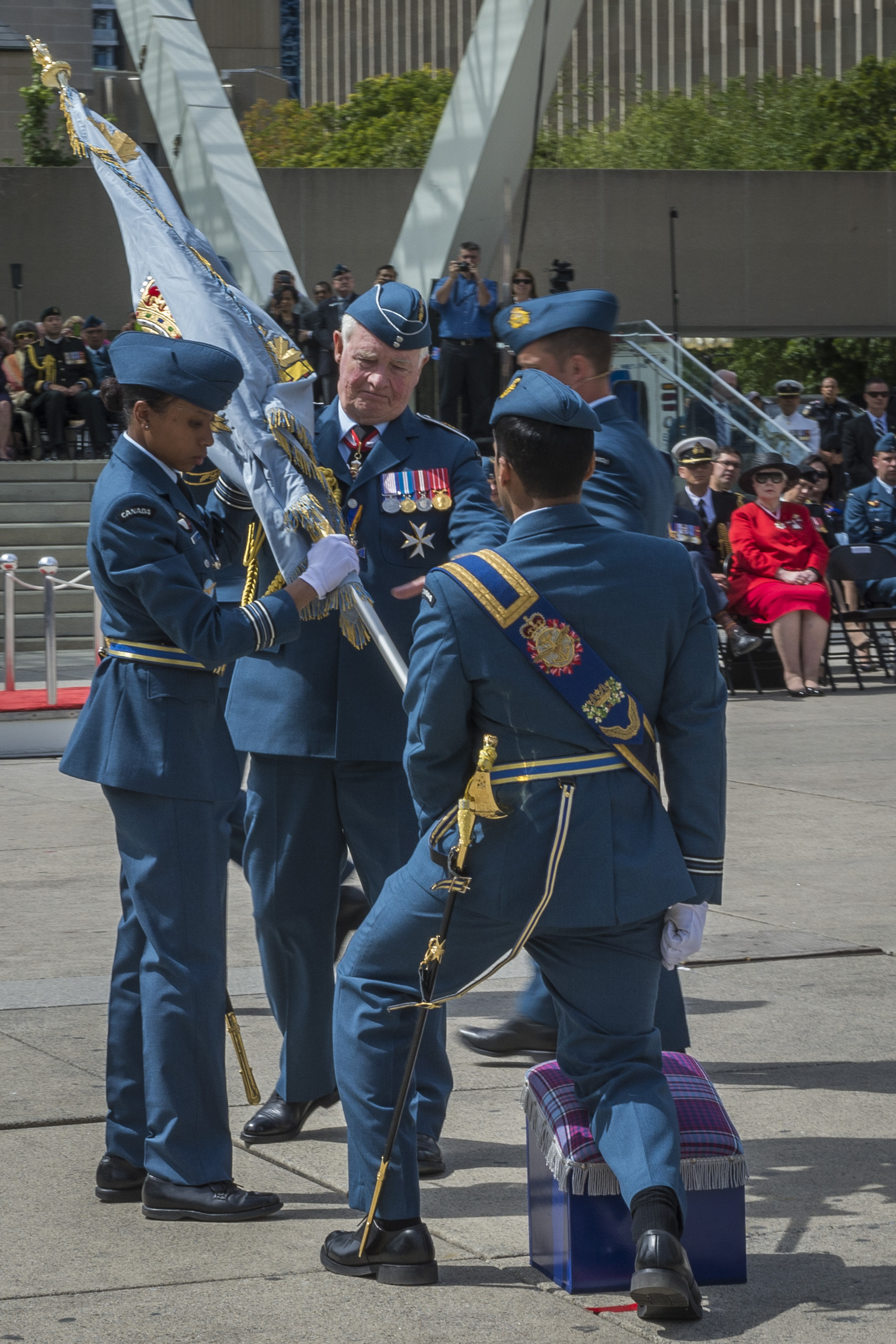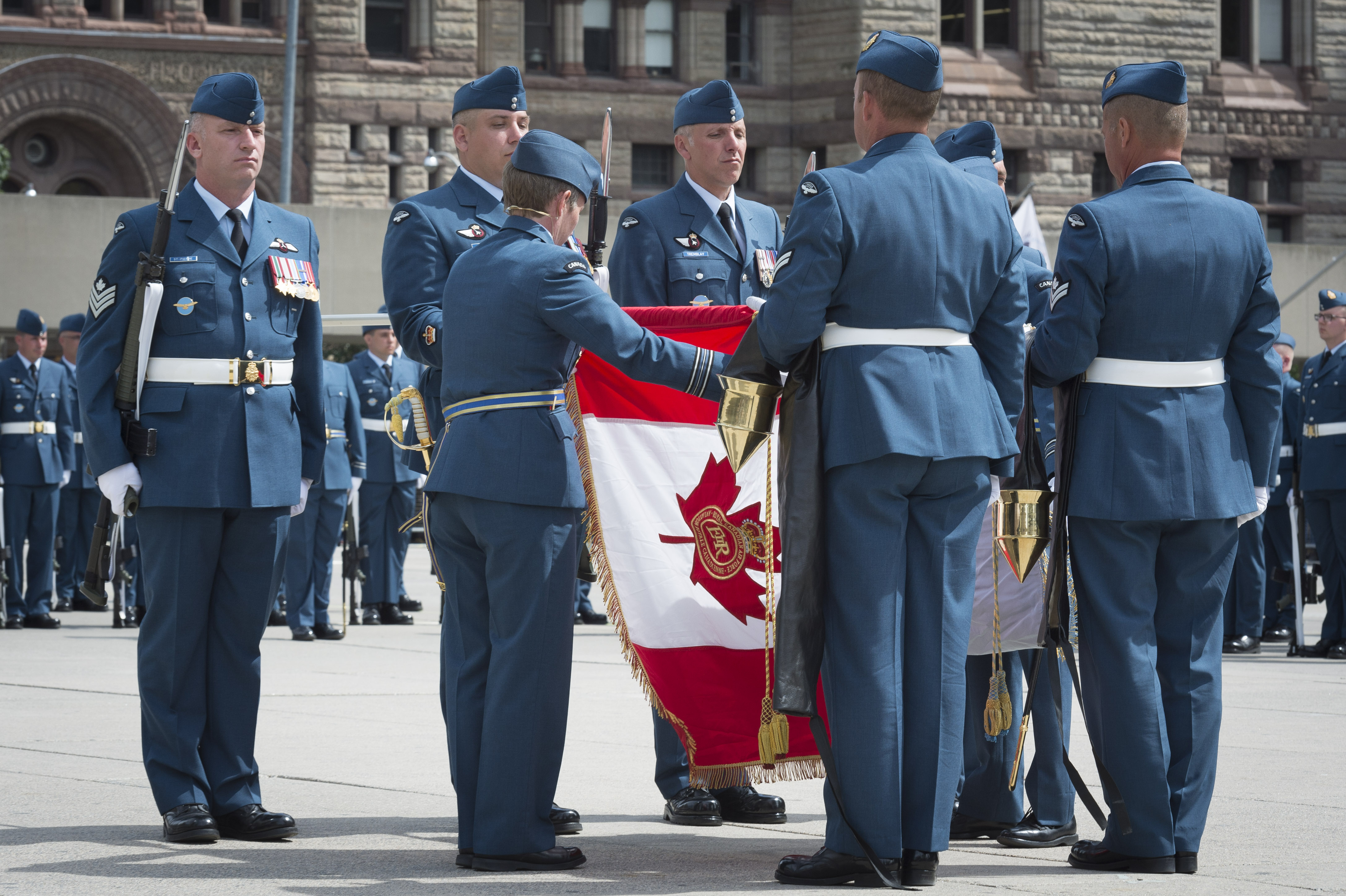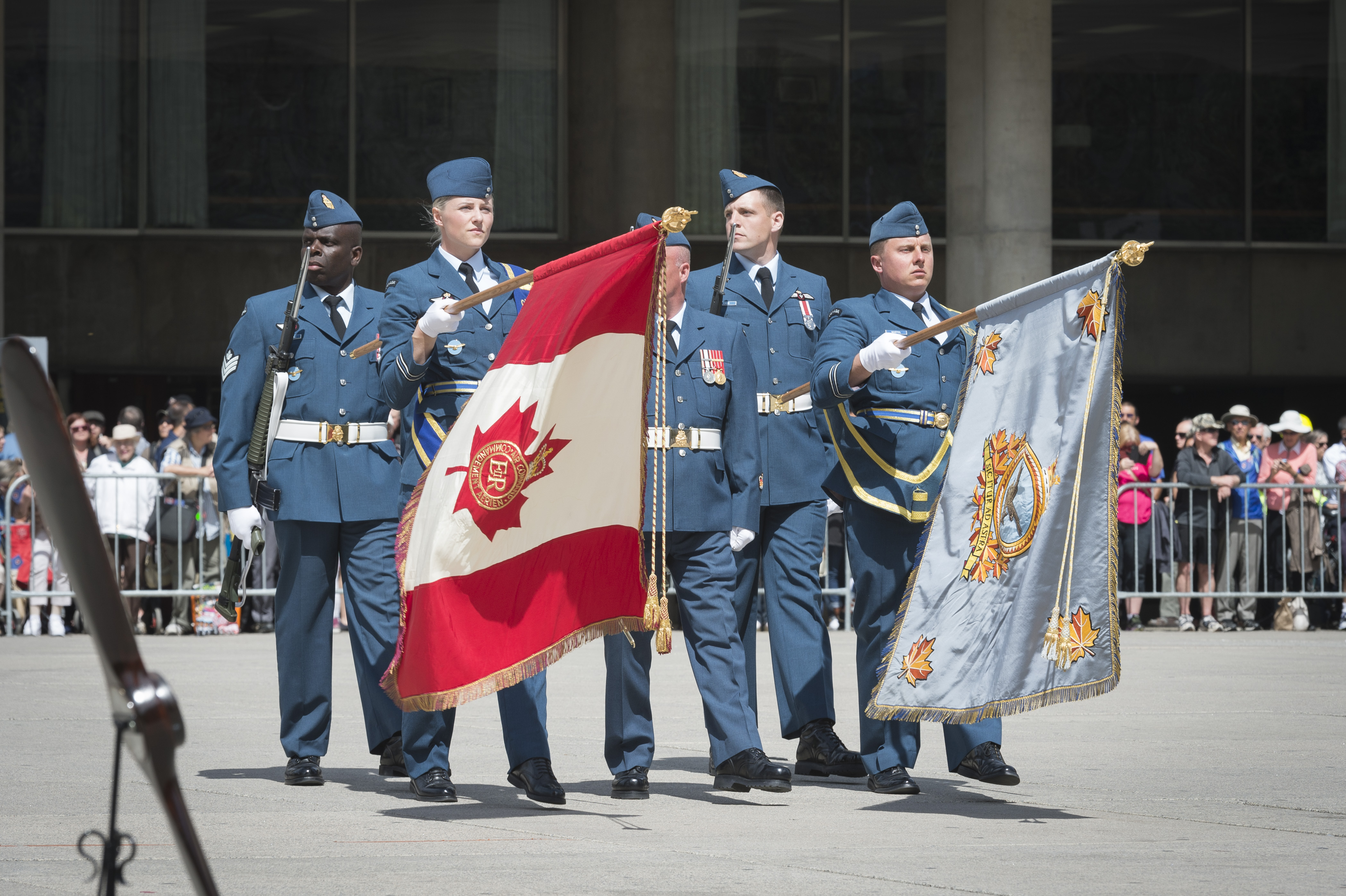 At midday, the presentation and consecration ceremony began when RCAF personnel from the Canadian Forces School of Aerospace Technology and Engineering, 16 Wing headquarters and the Royal Canadian Air Force Academy, all located in Borden, Ontario, who had been rehearsing intensely for several weeks, marched onto Nathan Phillips Square. They were accompanied by The Central Band of the Canadian Armed Forces and the RCAF Pipes and Drums. Master Warrant Officer Kimberly Jones carried the Eagle Staff, which represents all Aboriginal members of the Canadian Armed Forces: past, present and future.