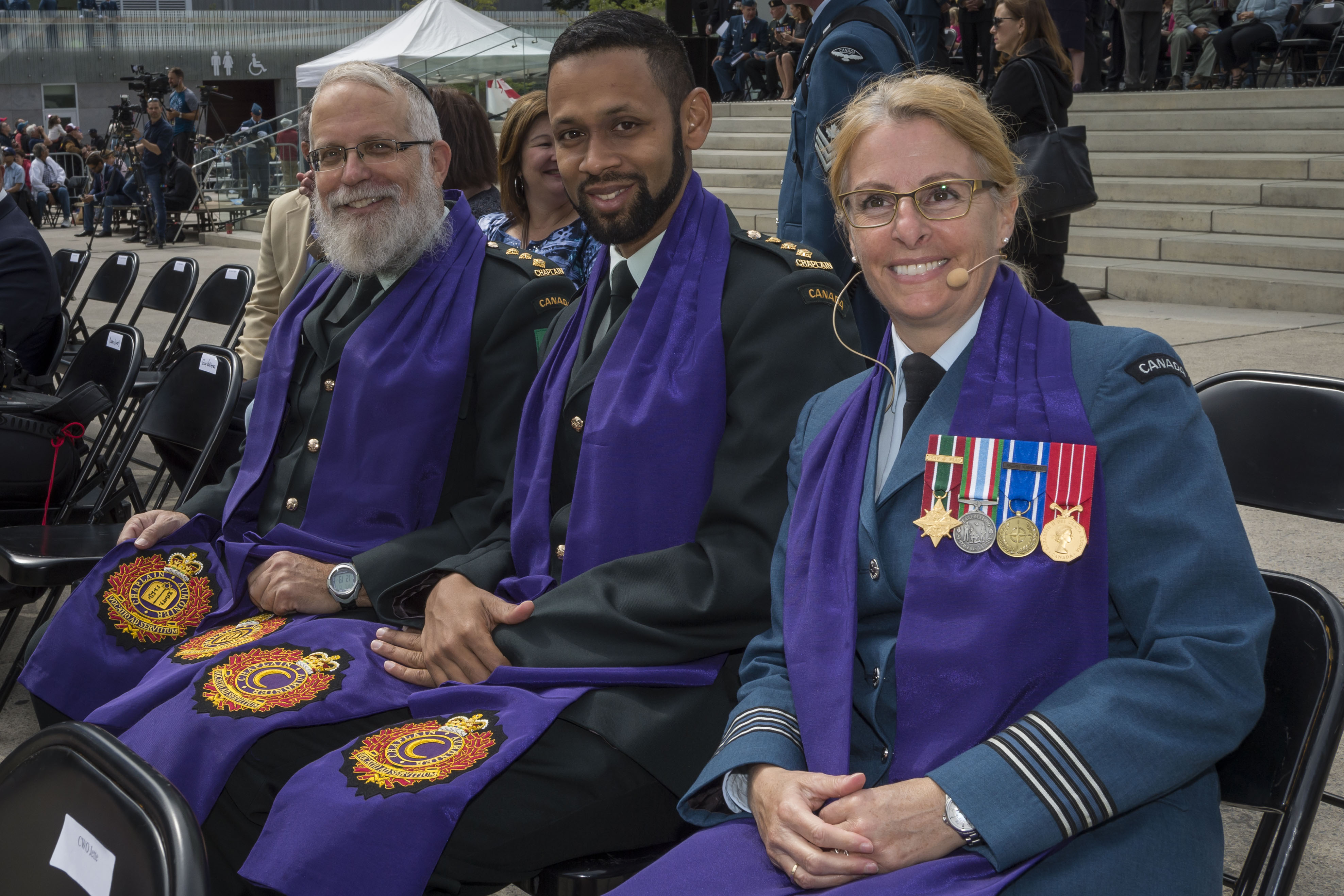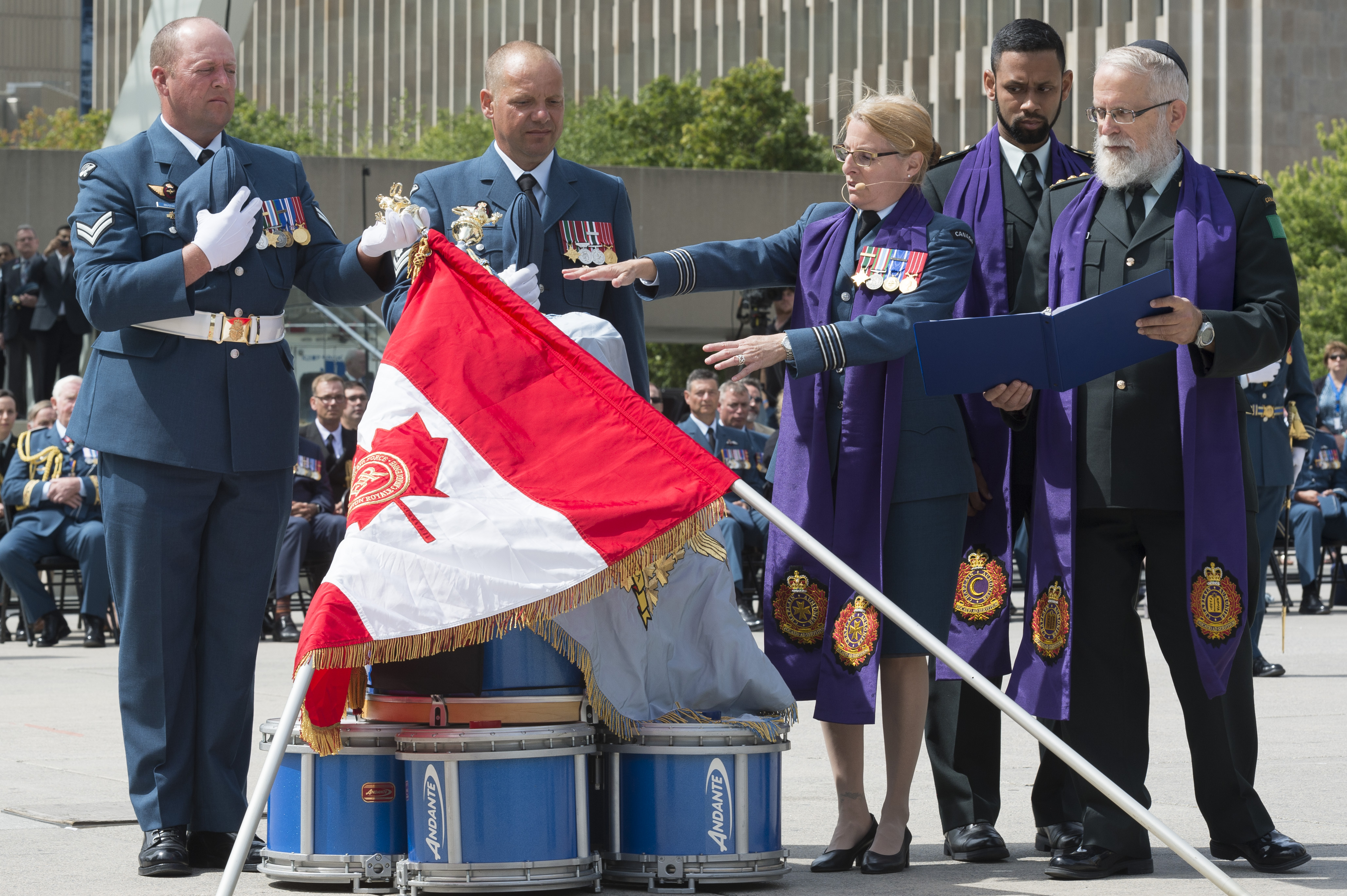 As the aircraft flew overhead, the members of the RCAF Pipes and Drums piled their drums as an altar and the new Colours were draped across them. The senior RCAF chaplain, Lieutenant-Colonel Martine Bélanger, accompanied by Rabbi Captain Lazer Danzinger and Imam Captain Ryan Carter, then offered prayers and conducted the service of consecration.