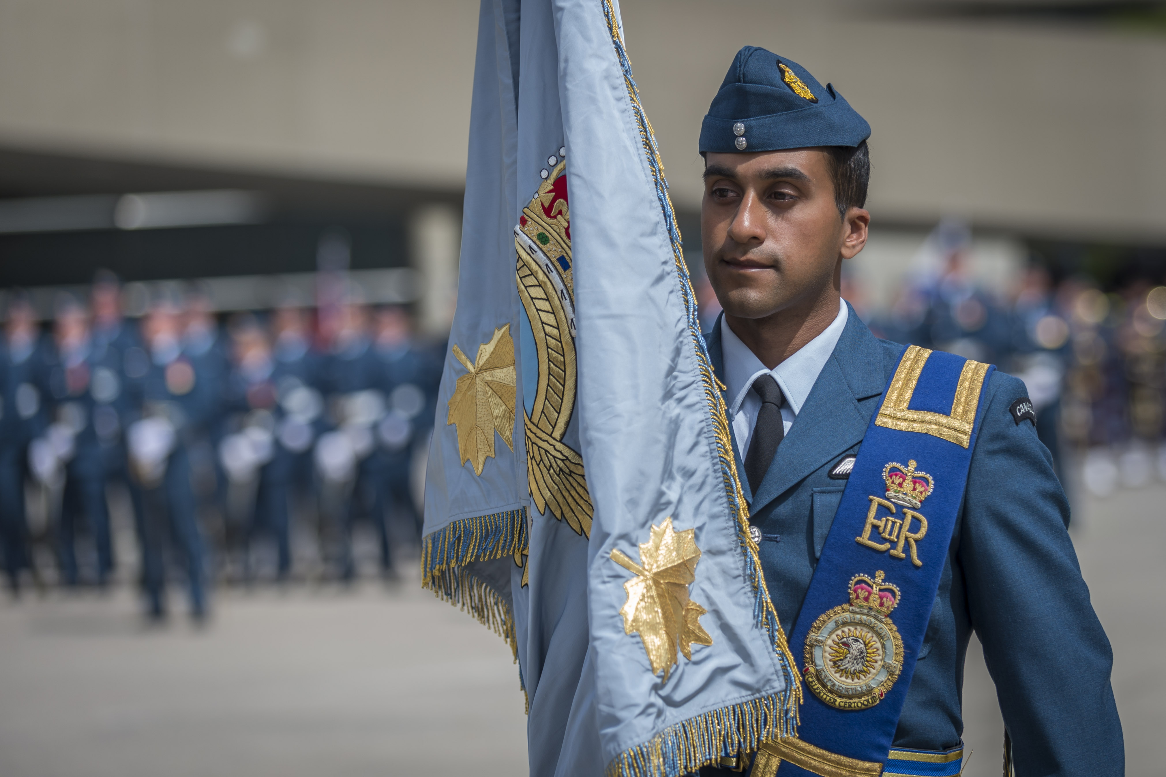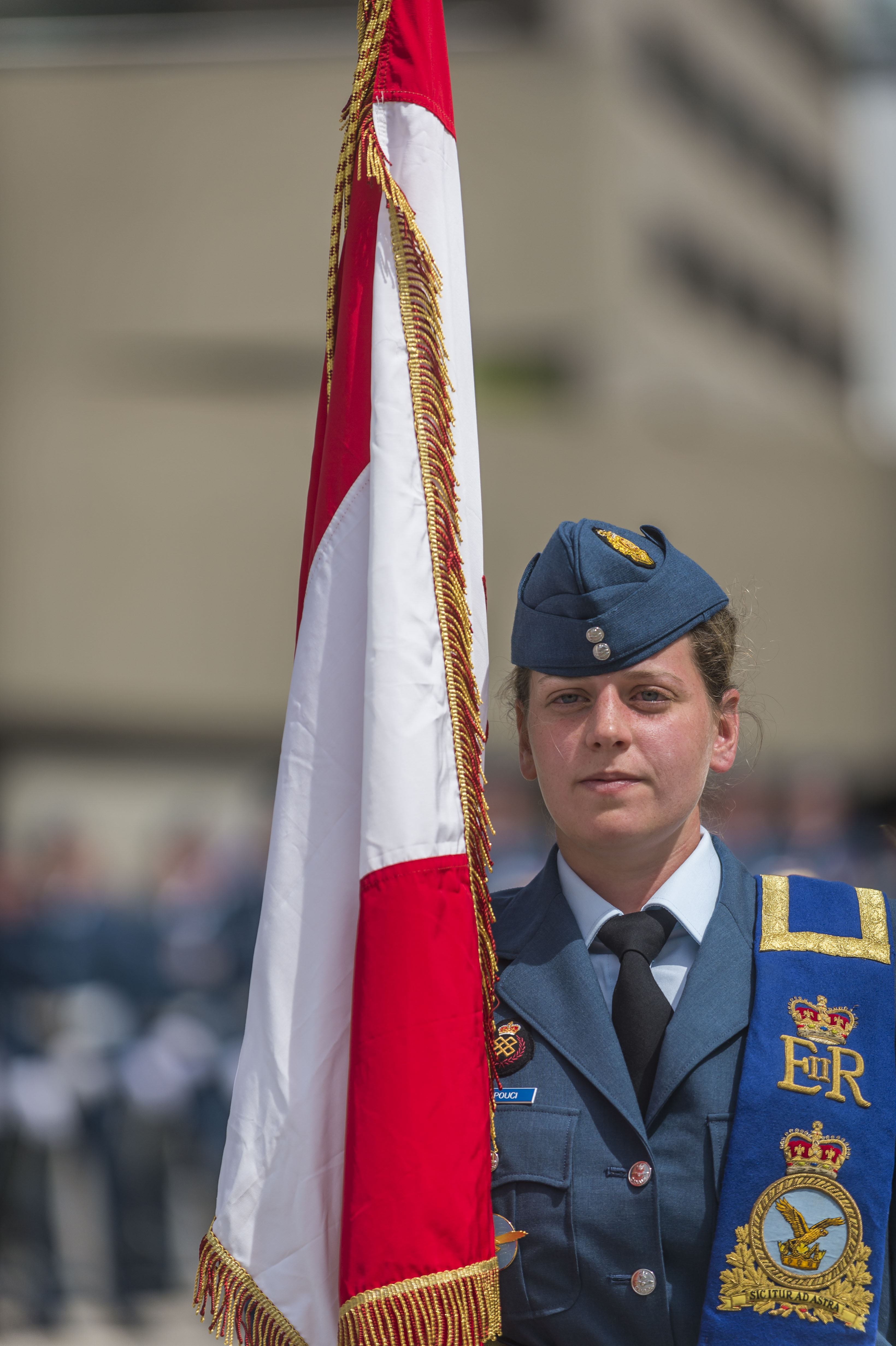 The Air Command Colours were entrusted to specially selected members of 402 “City of Winnipeg” Squadron, located in Winnipeg, Manitoba. Captain Louis Martel and Captain Emily Nissen carried the two Colours, while Warrant Officer Robyn Arnold, Sergeant Spencer Cass and Sergeant Christopher Longman were escorts. Although Colours are no longer carried into battle, these personnel would have been responsible for defending the Colours against the enemy in a past era.
