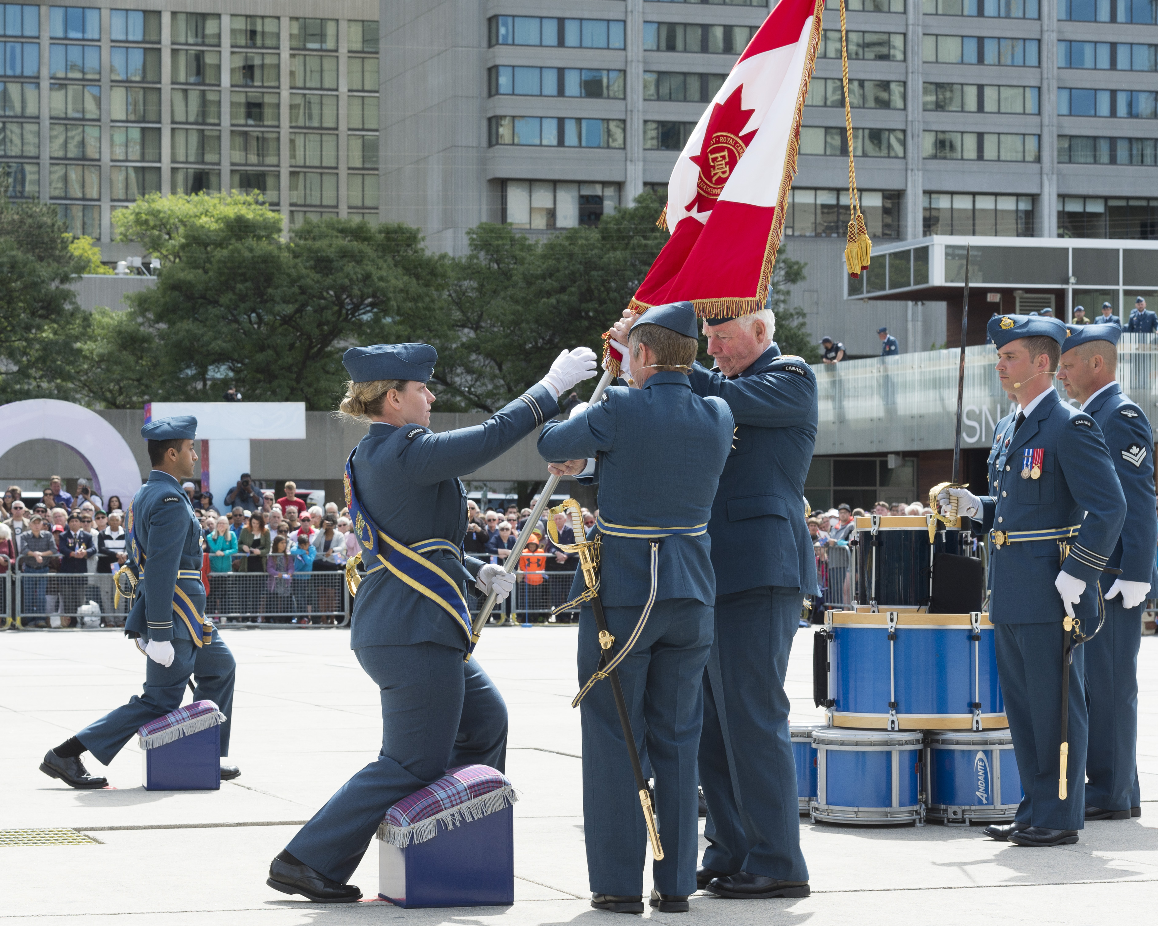 On that day, one of the most significant ceremonial events in the RCAF’s history took place as Governor General David Johnston, also attired in Air Force blue, presented new Colours – unique, consecrated ceremonial flags – to the RCAF. It was only the third time in the RCAF’s 93-year history that new Colours had been presented.