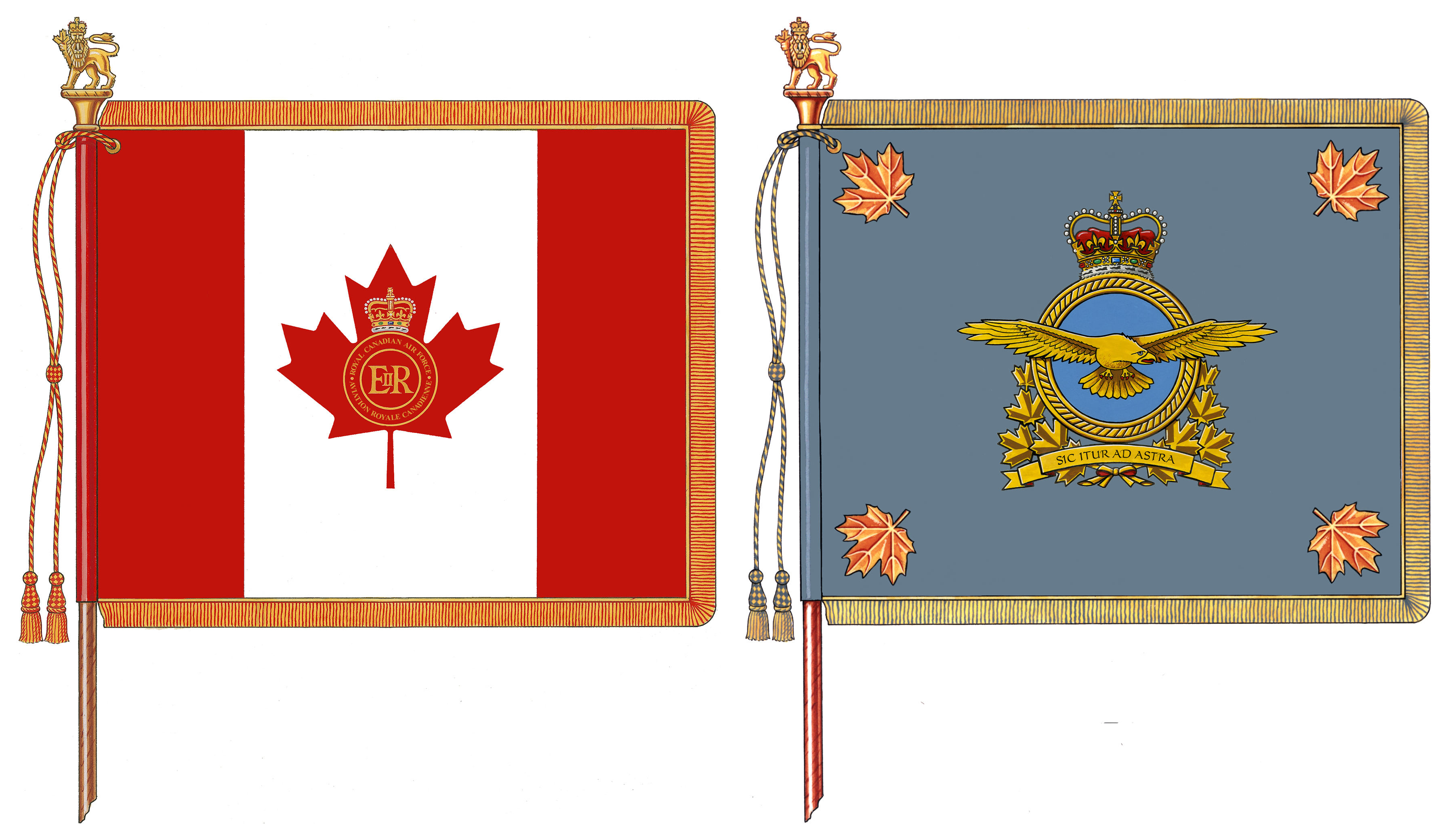 The first “stand” of Colours – a King’s Colour and an RCAF Colour – was presented in the name of King George VI on June 5, 1950 (the King’s birthday), on Parliament Hill in Ottawa by Governor General Viscount Alexander of Tunis. The second stand was presented following the unification of the Canadian Armed Forces, which had resulted in the Canadian Armed Forces’ air elements being grouped under Air Command. Governor General Edward Schreyer presented the Queen’s Colour and Air Command Colour in Winnipeg, Manitoba, on July 31, 1982.