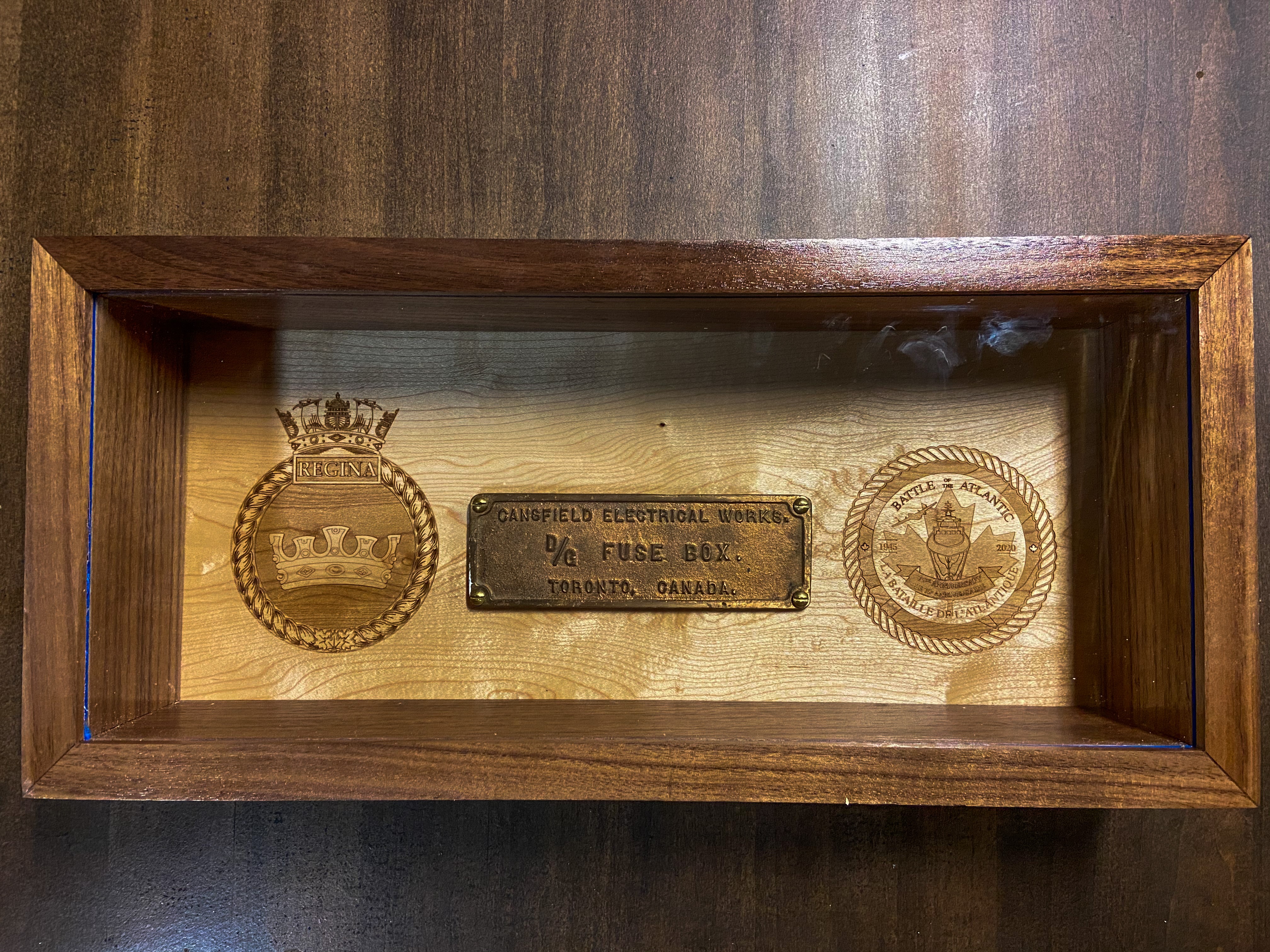 To aid in the transport and storage of the artifact, several maritime technicians on board Toronto fabricated a shadow box made of wood featuring Regina’s crest and the RCN’s Battle of the Atlantic 75th anniversary crest.