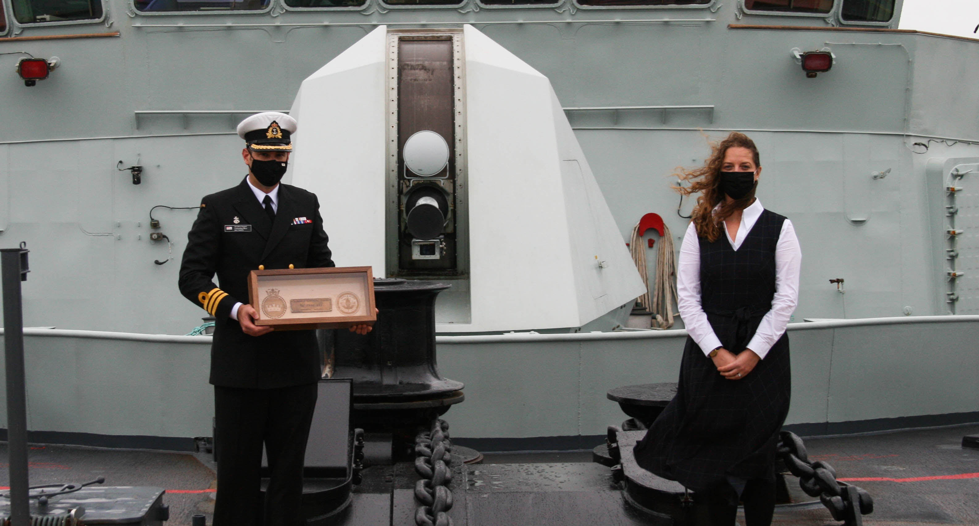 The presentation was made on board Toronto during its recent visit to Naval Base Portsmouth, England, as part of the frigate’s mid-deployment rest and maintenance period. While alongside in England, mitigation strategies were adopted to minimize the crew’s risk of contracting COVID-19, including restricting shore leave. Toronto is presently deployed to Europe in support of Operation REASSURANCE, where it’s been operating with Standing NATO Maritime Group One.
