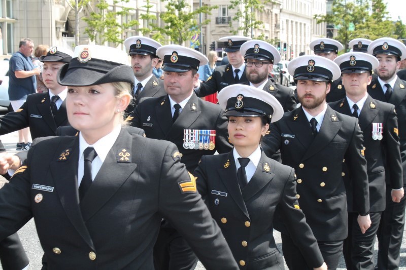 Canadian Naval Reservists marched in the parade at the commemoration of the 80th Anniversary of the Battle of the Atlantic in Liverpool, United Kingdom (UK), May 28th, 2023.