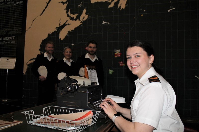 S1 Sarah Walsh, (right) a Naval Reservist from HMCS Cabot, in St. John’s, Newfoundland, tries out a vintage typewriter while other Naval Reservists stand by the plotting board during a tour of the Western Approaches Museum in Liverpool, United Kingdom (UK), May 24th, 2023.