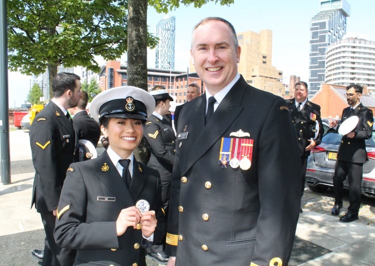 Cmdre Patrick Montgomery, Commander Naval Reserve, (right) presents a Naval Reserve Centennial coin to S2 Kelly Le, a member of HMCS Discovery, at the commemoration of the 80th Anniversary of the Battle of the Atlantic in Liverpool, United Kingdom (UK), May 28th, 2023.