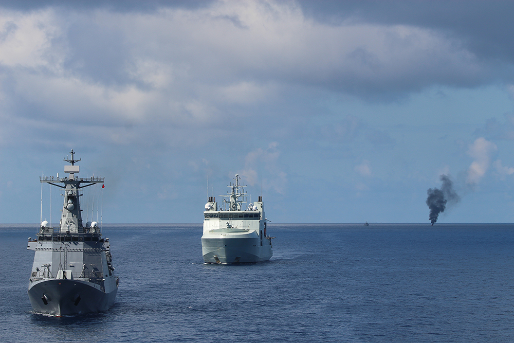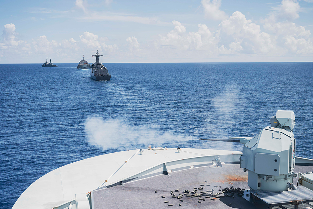 Barko ng Republika ng Pilipinas (BRP) Ramon Alcaraz (Left) United States Ship (USS) Cincinnati (Middle) and BRP Antonio Luna in view of His Majesty's Canadian Ship Max Bernays during a GUNEX as part of Exercise SAMA-SAMA at sea on 13 October 2025.