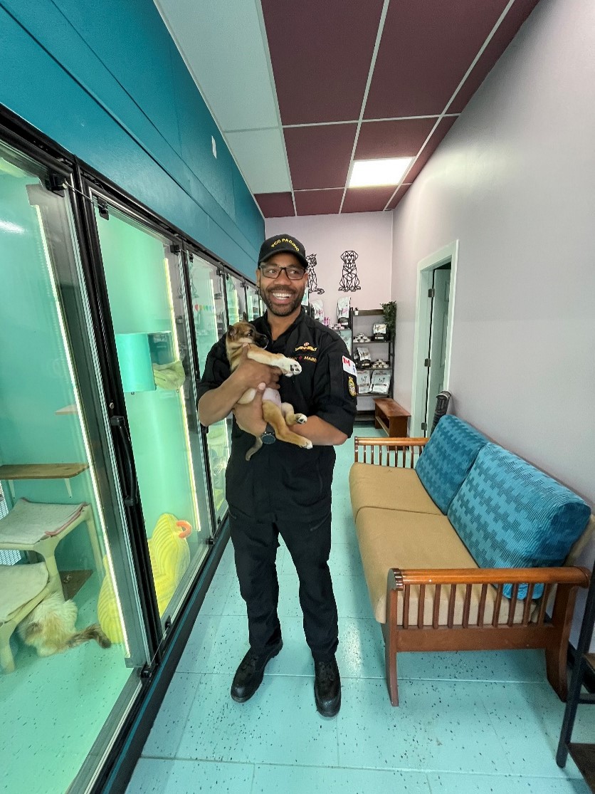 Petty Officer 1st Class (PO1) Yevrag Evans holds a puppy while volunteering at a local animal rescue shelter in his community.