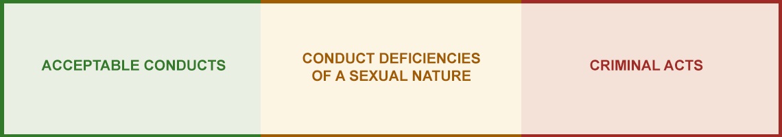 This page outlines a spectrum of conduct—from acceptable to unacceptable—that can impact CAF members and the workplace environment and culture. Sexual and gender-based violence, which falls within the categories of inappropriate behaviours and criminal conduct, may be subject to administrative and/or disciplinary action, and/or the criminal justice process.