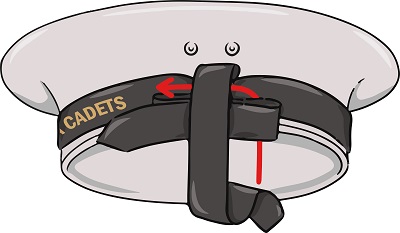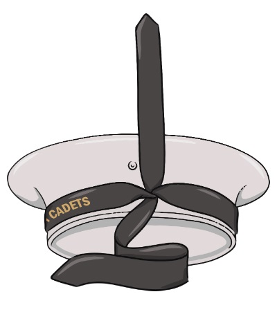 - Sailor’s Cap. (see Figures 2-2-6 through 2-2-8) Worn so that the rim of the cap is 2.5 cm (1 in) above the eyebrow. The front seam is centred directly over the nose. The chin stay shall be sewn inside the cap at the correct length to permit the stay to fit under the chin. It may be worn with Royal Canadian Sea Cadet or corps cap tally. If Royal Canadian Sea Cadet, the centre of the lettering on the cap tally (between the “I” and “A” of the word “CANADIAN”) should be in line with the front cap seam. For the corps name, fold in half from the “R” (RCSC) to the last letter of the corps name, and centre to line up with the front cap seam. It is tied in a neat bow, not more than 7.5 cm (about 3 in) and not less than 5 cm (about 2 in) across, the ends being of equal length. The bow is to be centred on the left ear vents. The chin stay shall be worn down by cadets wearing webbing if parading as a member of a band, guard or colour party;