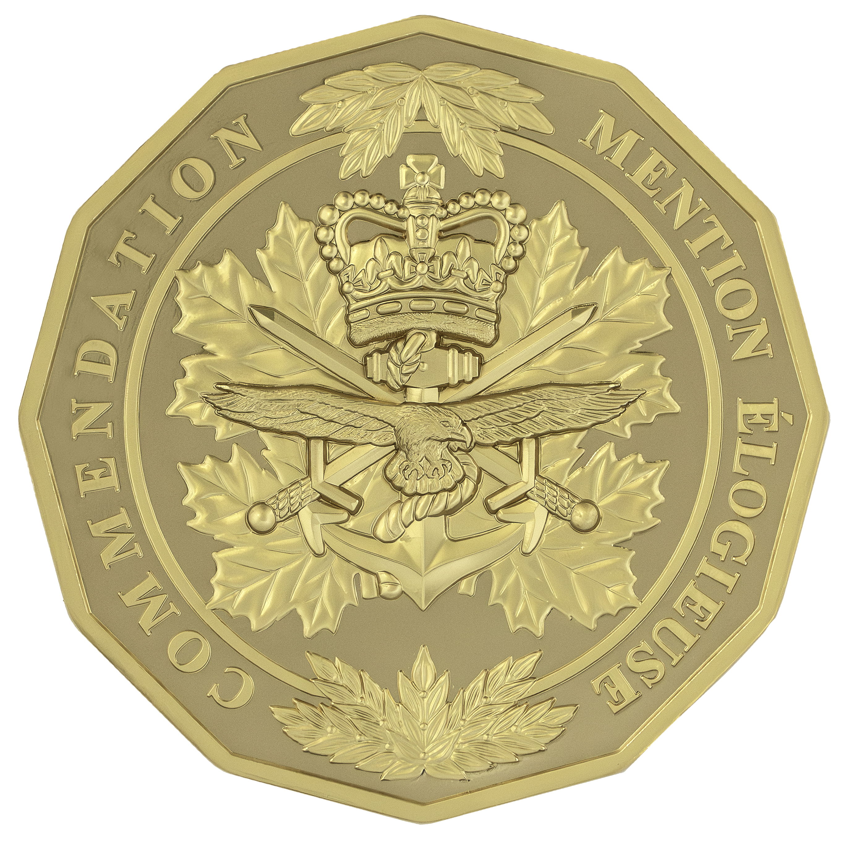 - a twelve-sided gold coloured medallion, 76 mm across the points, bearing on the obverse the superimposed symbols of the three services: the anchor, the crossed swords, and the flying eagle, topped by the Royal Crown; the whole superimposed on four maple leaves within a raised circle. On the edge of the medallion appear, between branches of laurel leaves, the inscriptions “COMMENDATION” and “MENTION ÉLOGIEUSE”. The reverse displays a wreath of laurel and maple leaves around the perimeter, leaving the center plain to allow the engraving of the unit’s name; and