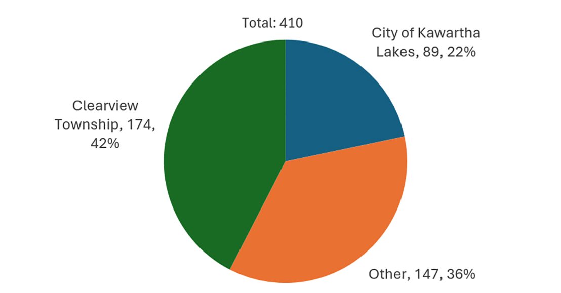 Respondents represented a diverse geographic range. Of the 410 responses, 174 individuals identified as residents of Clearview Township, 89 as residents of Kawartha Lakes, and 147 as residing elsewhere, as shown in Figure 2.